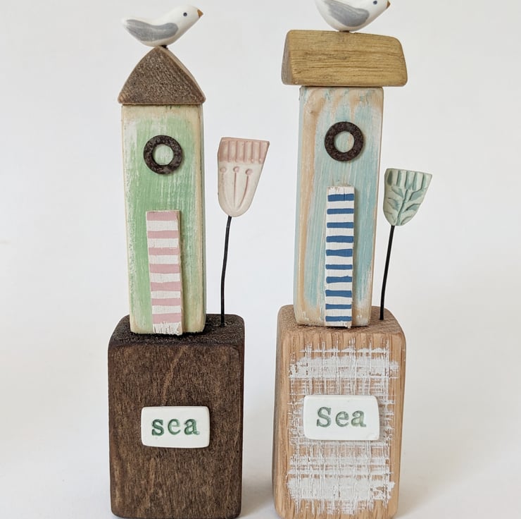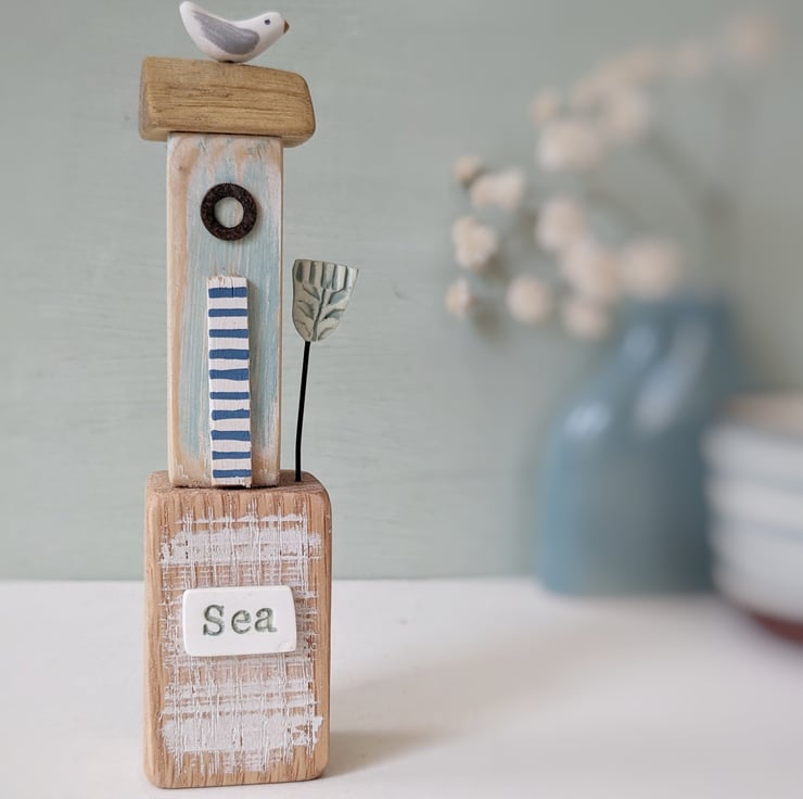This is one of my tiny little rustic sea huts with a porthole window, a happy flower, and a hand stamped base.