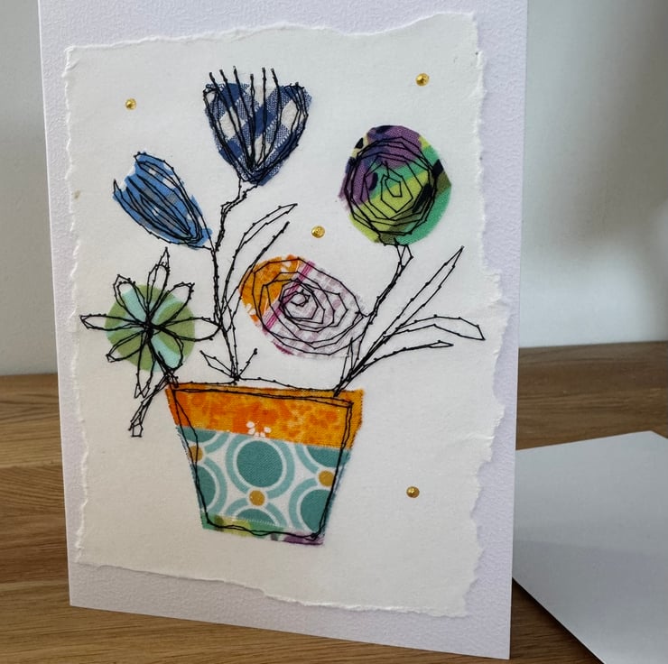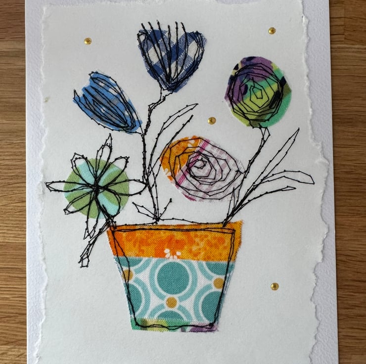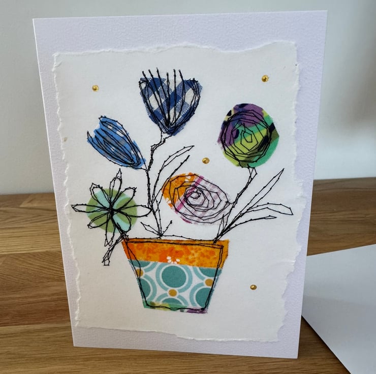A charming handmade card featuring a colourful flower pot brimming with whimsical, fabric flowers. Created using free-motion stitching, each bloom is crafted from patterned fabrics, sewn onto textured paper with torn edges for a rustic, handcrafted feel. Gold embellishments add a touch of sparkle, making this card a delightful keepsake.