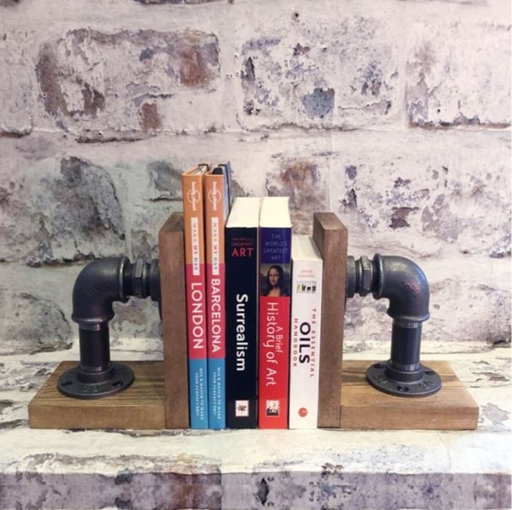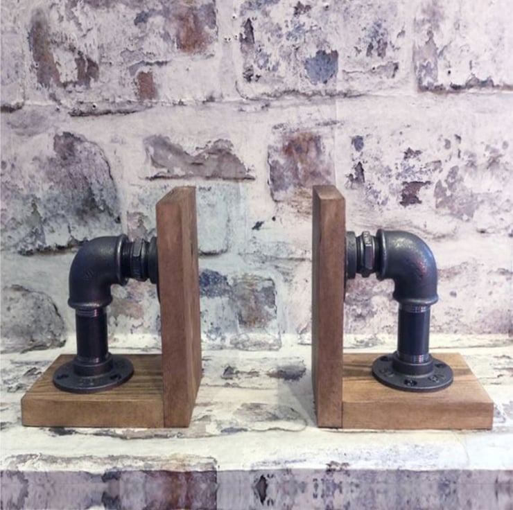 - The bookends are made from pine wood, cast iron fittings and metal pipes.