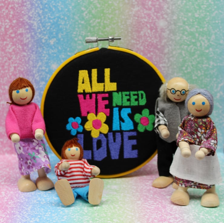 Each word has been stitched in a different font and colour for playful impact — with a nod to 60s flower power and modern-day kindness. Whether you're gifting it to someone special or brightening up your own walls, this hoop is a daily reminder of what really matters.