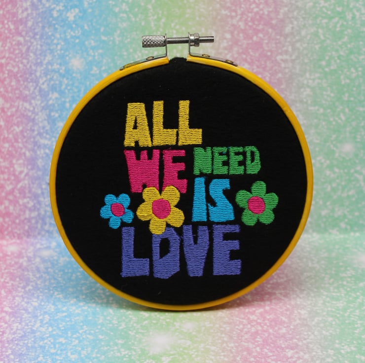 This piece was machine-stitched by me in my studio, inspired by a love of bold colours, playful typography, and that timeless message of kindness: All We Need Is Love. I wanted to create something joyful and uplifting — a piece that feels like a warm hug and a flash of flower power on the wall. Every stitch was placed with care, making this hoop a burst of happy energy.