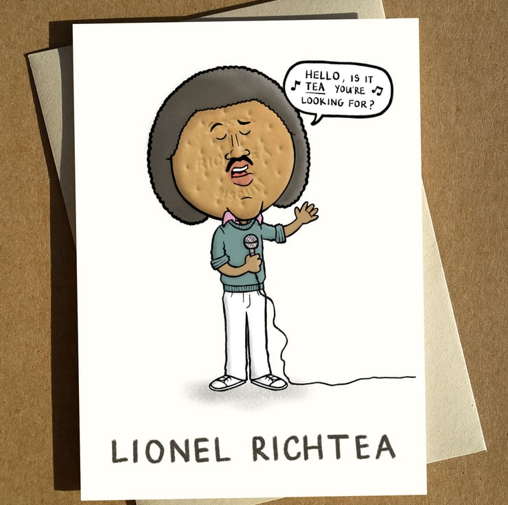 Featuring my original cartoon illustration 'Lionel Richtea', this pun-tastic greeting card is perfect for that special Lionel Richie / biscuit fan.