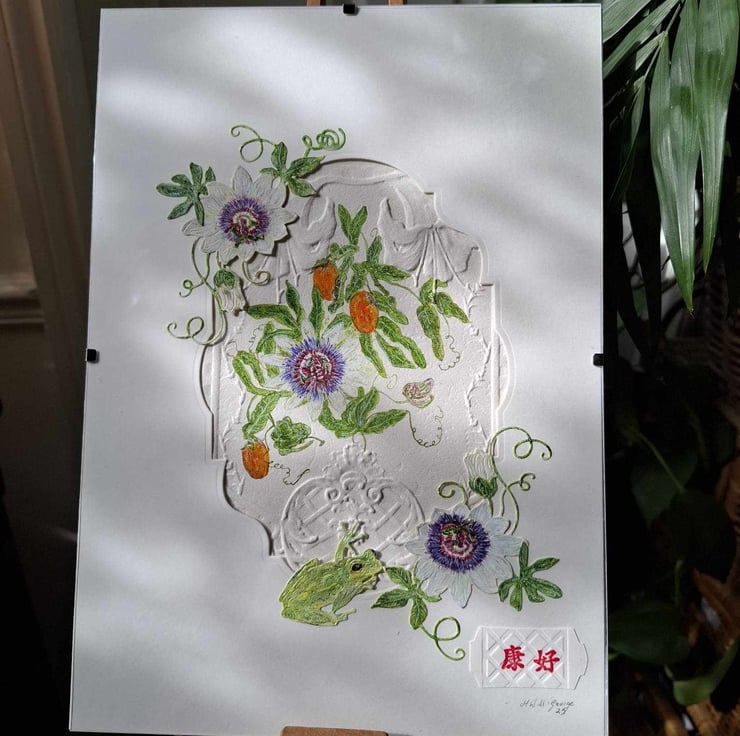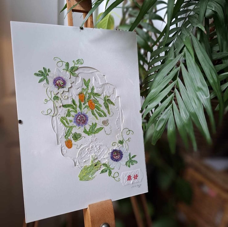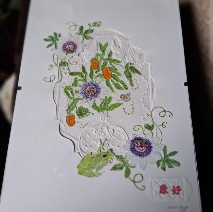 This Beautiful Painting Takes You On A Journey Through A Tropical Scene Of A Snow White Passion Flower And It's Orange Fruit While A Green Tree Frog Climbs Through The Stalks Looking For Any Visiting Insects. The Realism Of The Painting Is Achieved Through A Combination Of Water Colour, Mixed Media And Collage, Bringing The Artwork To Life And Transporting Your Imagination To A Tropical Paradise Where You Can Almost Feel The Warmth From The Sun While Listening To The Sounds All Around You And Smelling The Heavy Sent od All the Exotic Flora. The Painting Is In A 21cm x 30cm Travel Frame For Transport Perposes Only. Prices Reflect The Hours Of Creating This Beautiful And Unique Art Piece And Quality Of Materials Used .