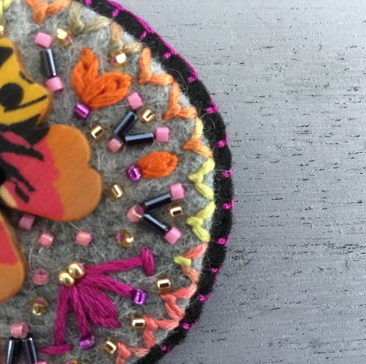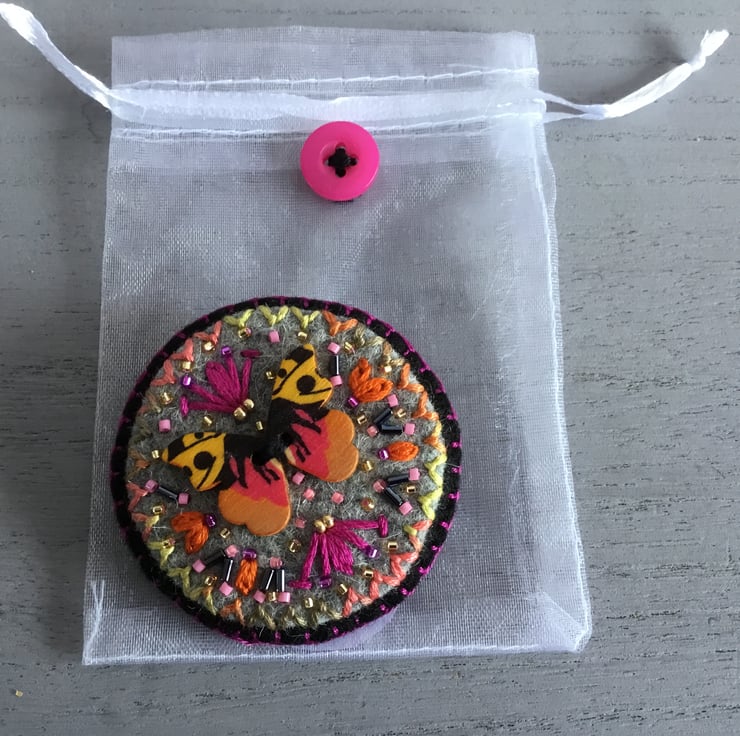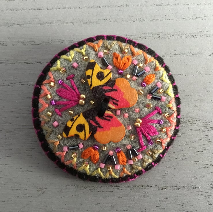 This Hand Embroidered Butterfly Brooch is in lovely tropical colours of yellow, orange and pink. A colourful wooden Butterfly button is sewn onto a circles of grey a black wool felt. This Butterfly is surrounded by hand embroidered Lazy Daisy, Fly, Long and Short Stitches…. embellished with golden, pink and black seed and bugle beads, edged in pink Blanket Stitches.