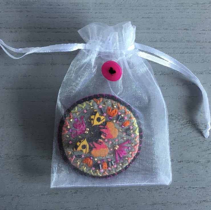 This brooch is gift wrapped in an organza bag, decorated with a pink button. A protective bag to keep the brooch in when not worn.