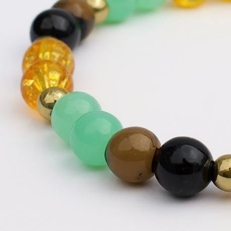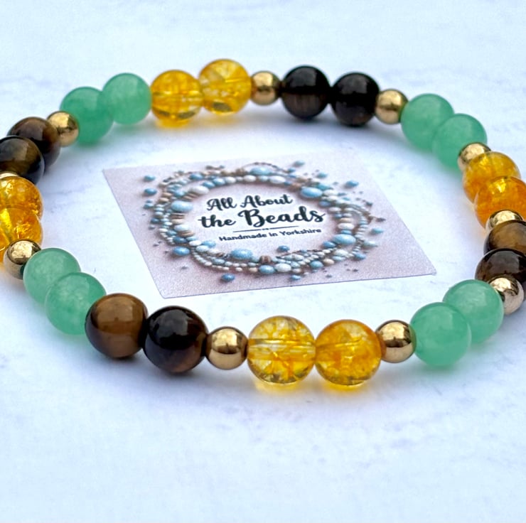 Elevate your energy and style with our stunning Chakra Bracelet, featuring vibrant green, yellow, and brown beads crafted from powerful 6mm gemstones. This beautiful piece combines Citrine for attracting wealth and abundance, Green Aventurine to enhance creativity and optimism, and Tiger's Eye for courage and balance. Accented with 4mm plated Hematite for added strength, this elasticated bracelet comfortably fits wrists sized 7-8 inches and can be easily adjusted. Perfectly gift-wrapped in tissue and a lovely organza bag, it makes a thoughtful present for yourself or a loved one!