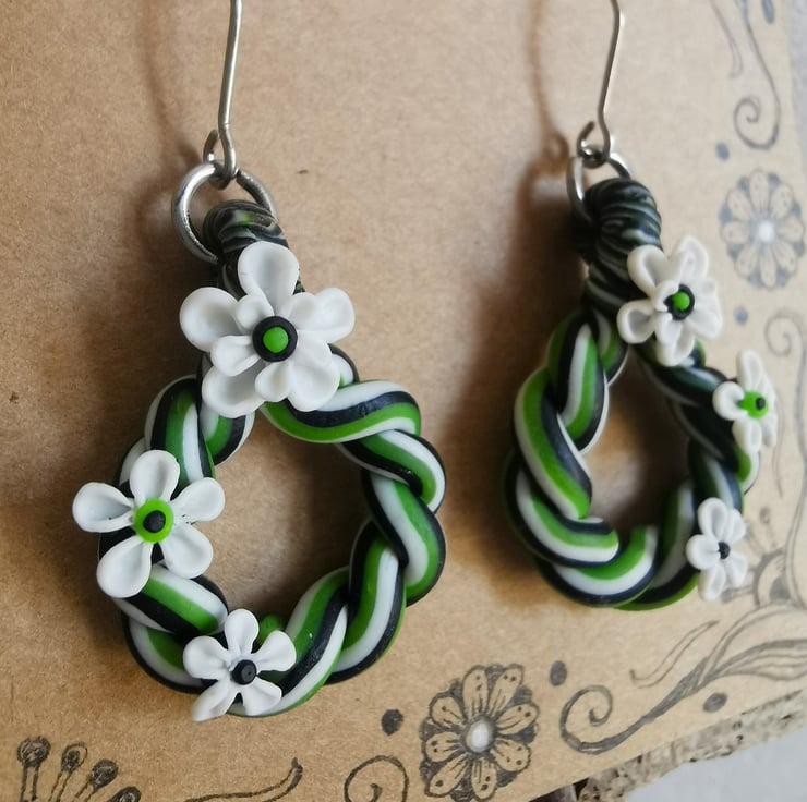 Small delicately sculpted flowers sat atop a twisted loop. I wanted to create something pretty and really enjoy fine detail work. The colour combination come from a love of contrast and a greater love for the colour green!