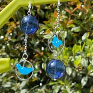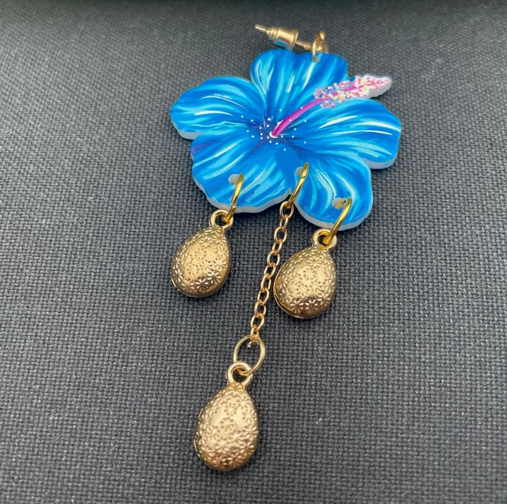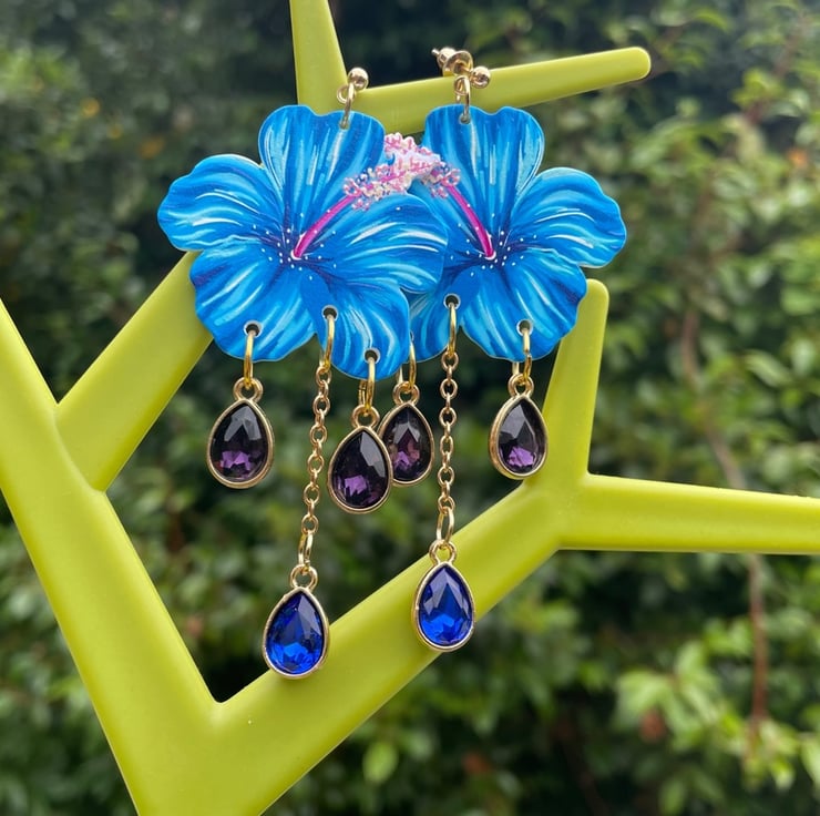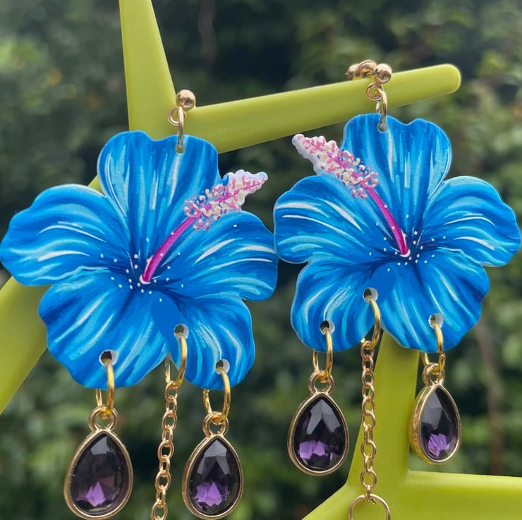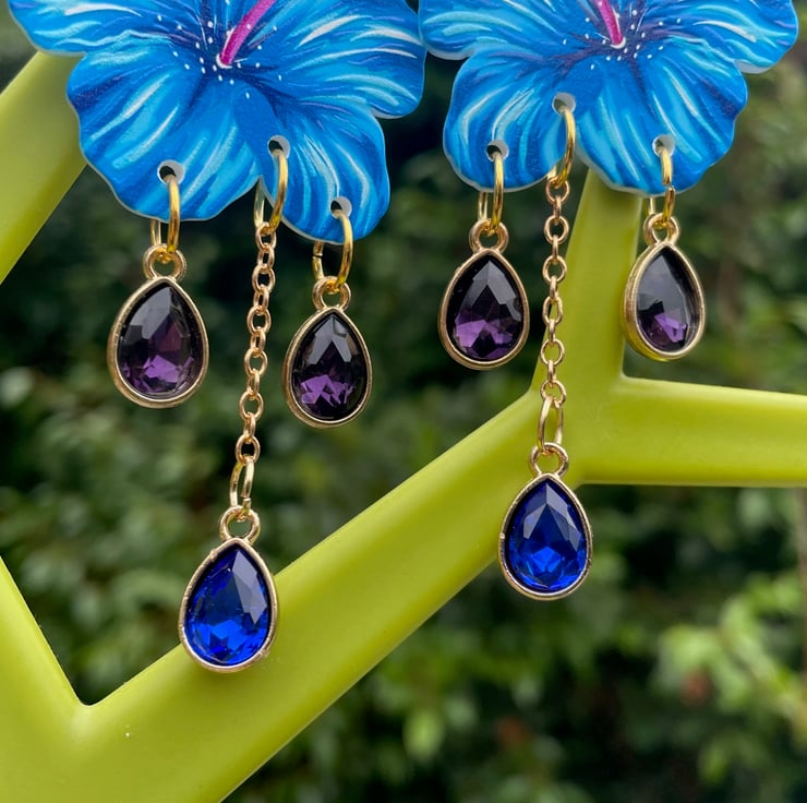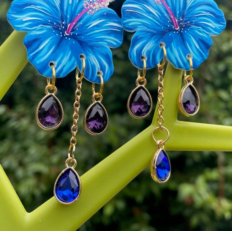 I've used gorgeous blue resin hibiscus flowers and paired them with crystals in a lovely purple and blue finished off with gold pushback posts.