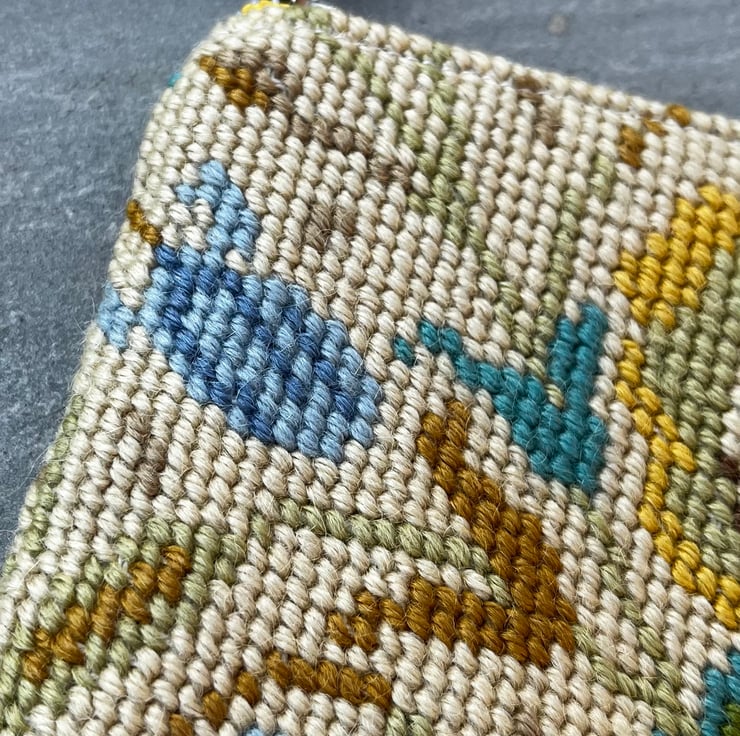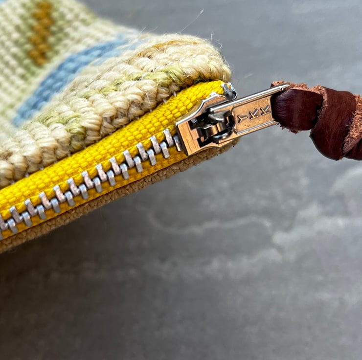 The pouch measures 18cm square. The metal zip is reclaimed. A strip of leather offcut from a local upholsterer makes the zip pull.
