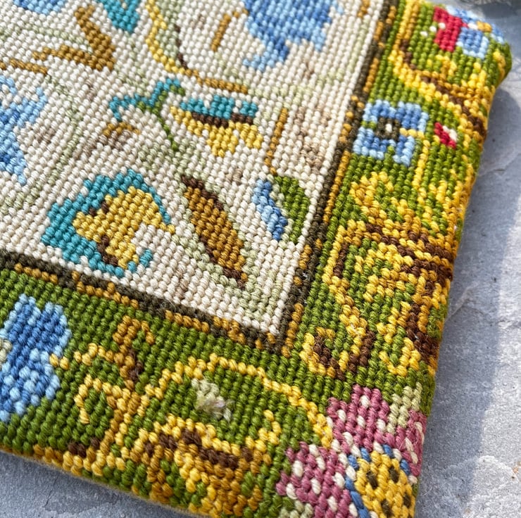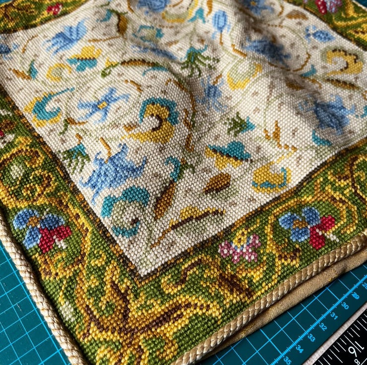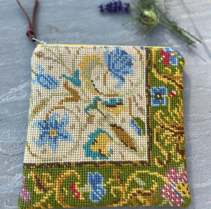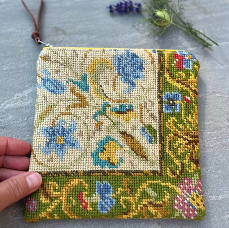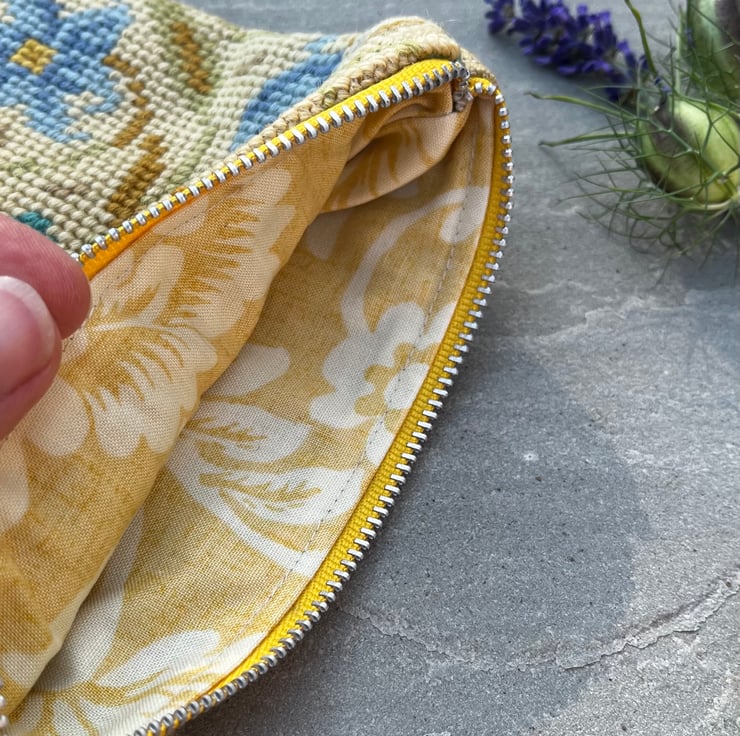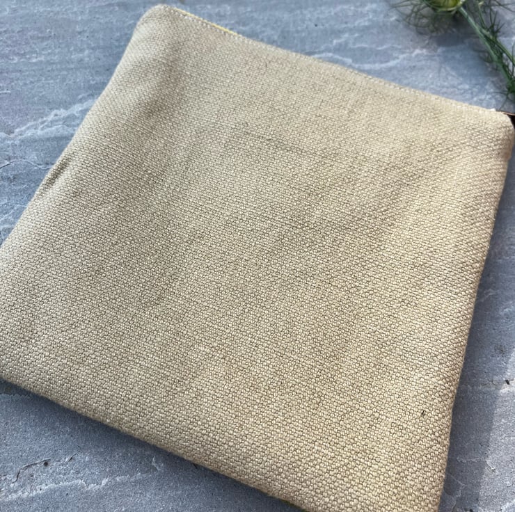 Pretty square zip pouch made from tapestry repurposed from an old cushion cover and thick sandy coloured linen blend canvas. The bag is fully lined with reclaimed GP&J Baker curtain fabric.