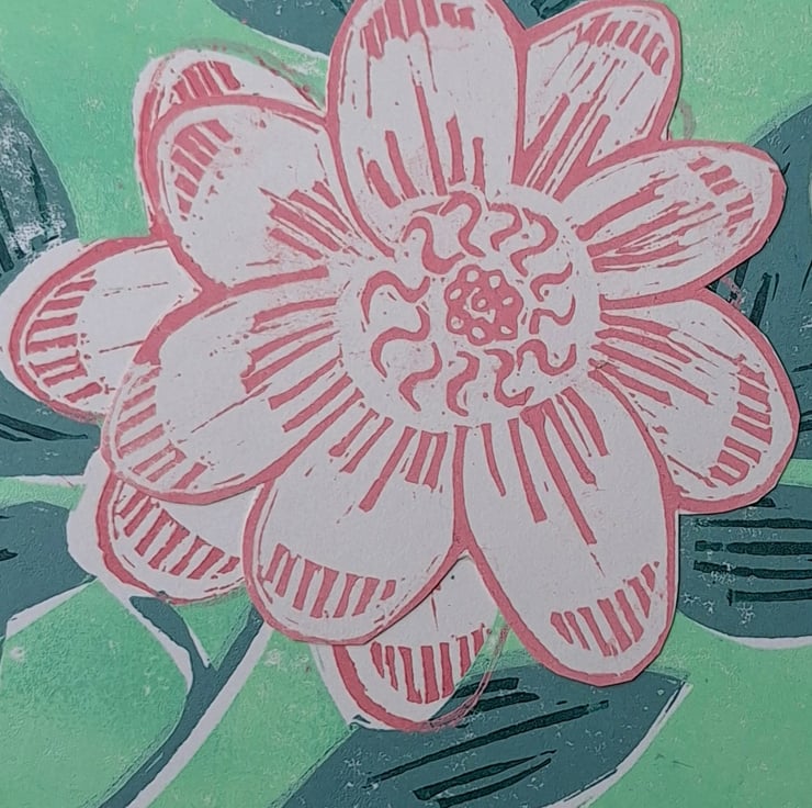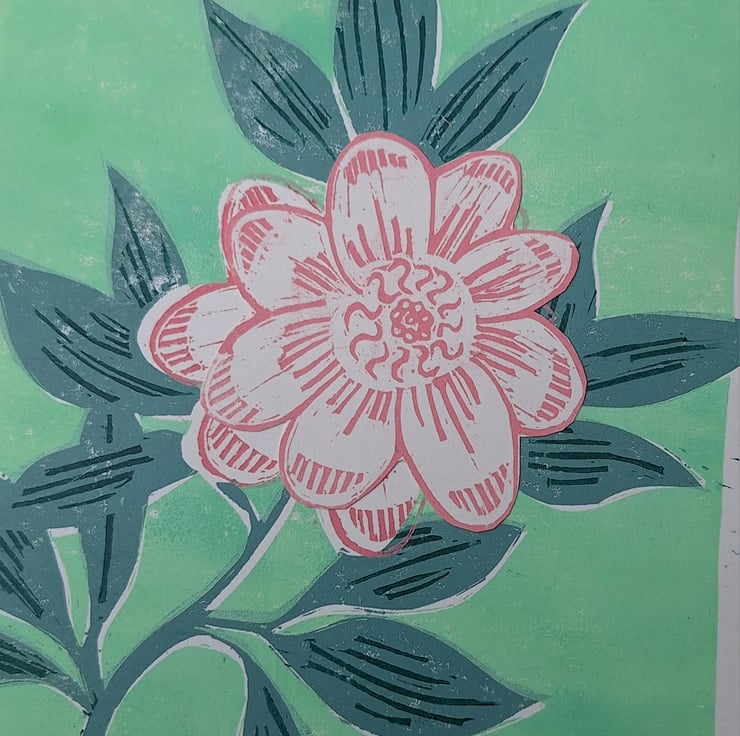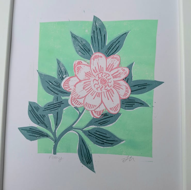 This beautifully bright and colourful reduction print and collage of a peony was designed and handprinted by me using the reduction method of lino printing.