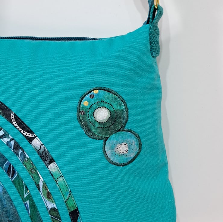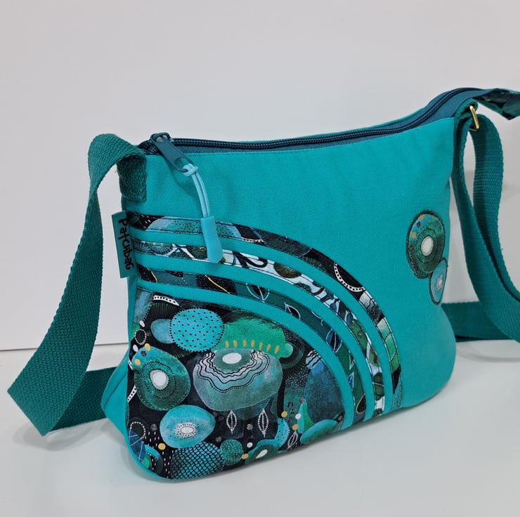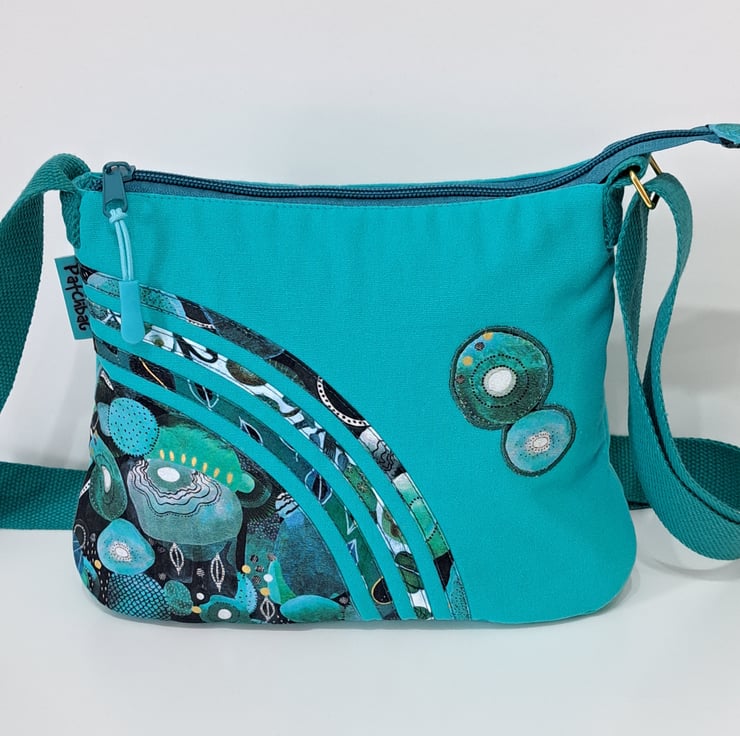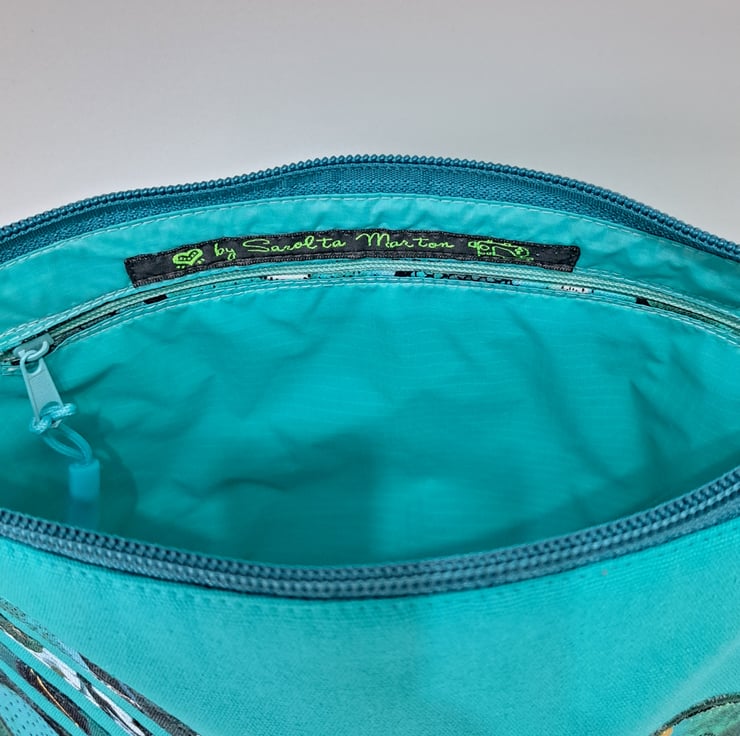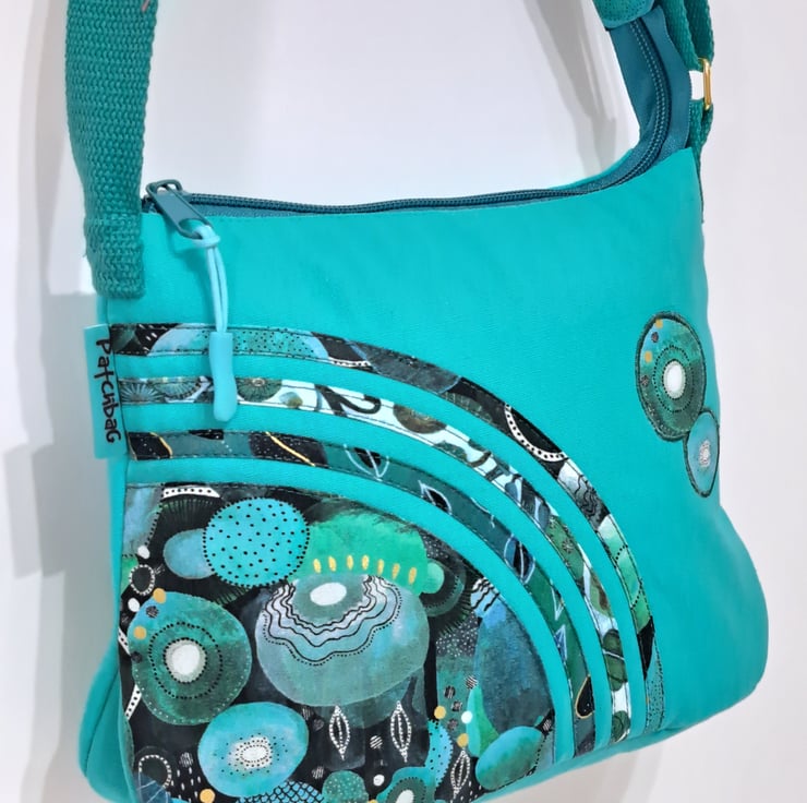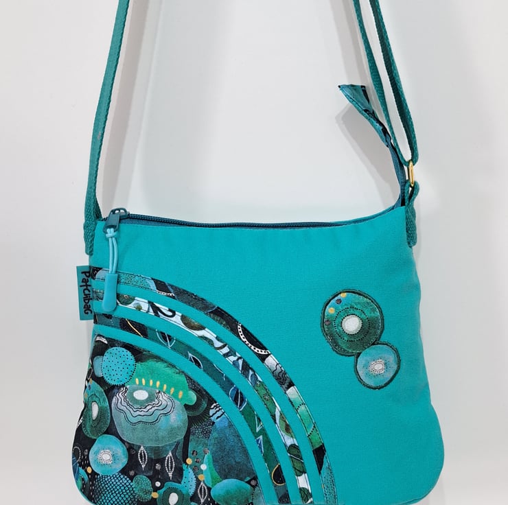 Small turquoise green patchwork handbag with wonderful watercolour pattern. The handcrafted unique handbag made from canvas fabric decorated with cotton fabrics. The lining made from waterproof fabric. The handbag has inner pocket with zip closure. The shoulder strap is adjustable with golden metal clasps. Maximum length of the strap is approximately 140cm. The shoulder bag has zip closure on the top.The main colors are turquoise and different shades of green. I used for my bag fantastic fabrics from Essoldo Design collection. This is a smaller handbag, the dimensions are the following:hight 20cm, width 27cm, depth 8.5 cm on the bottom of the bag.