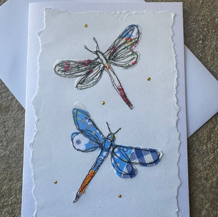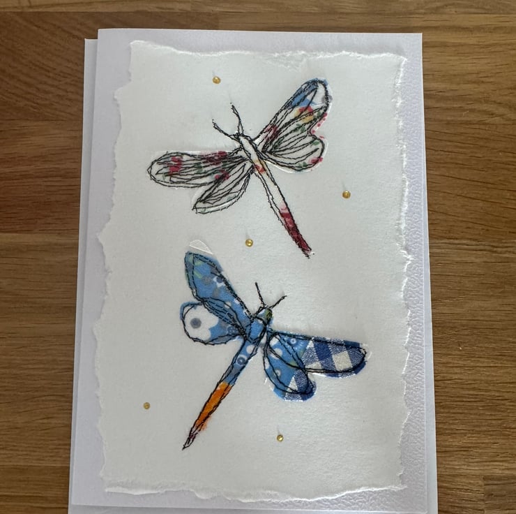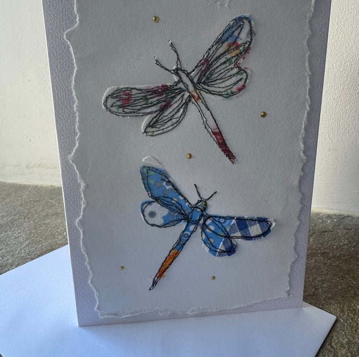 This is a beautiful handmade 5x7-inch blank card featuring two dragonflies created with free-motion sewing in black thread. The dragonflies are crafted from pieces of patterned fabric, giving them a lovely textured and slightly raised effect.