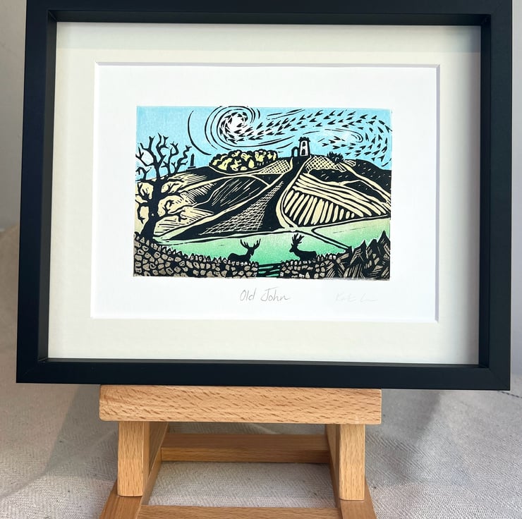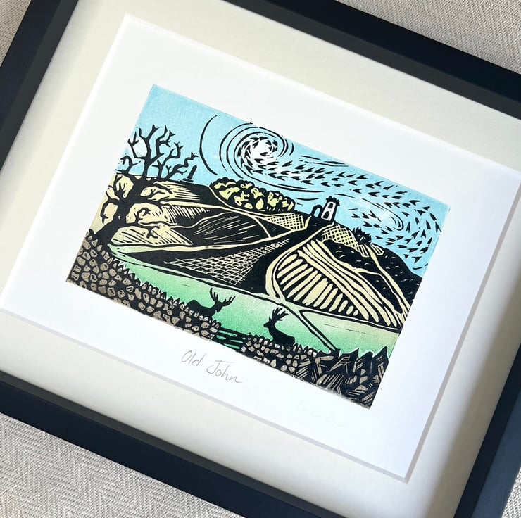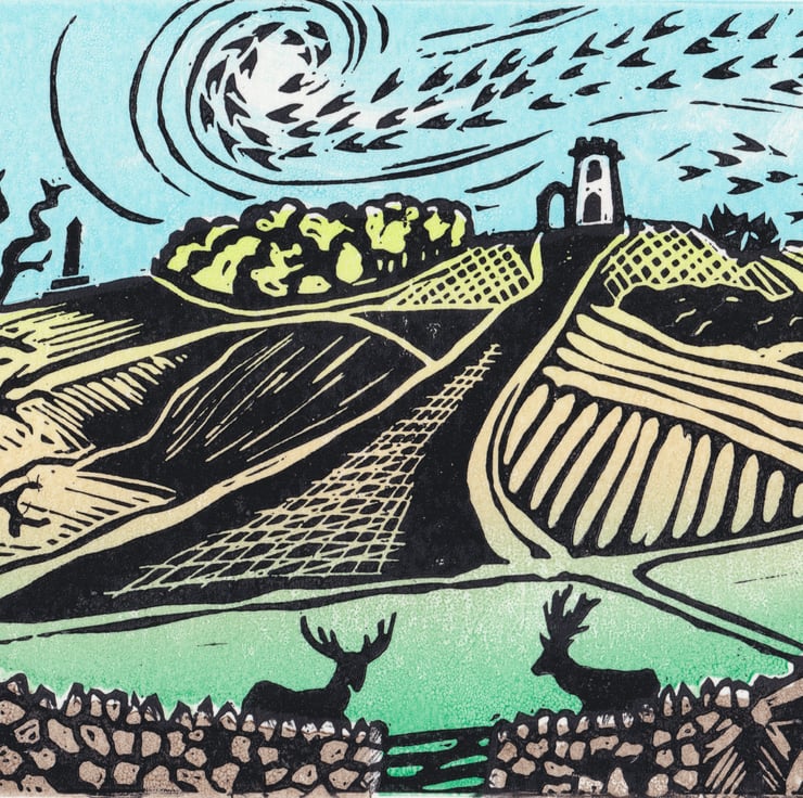 This Lino print of Bradgate Park shows Old John sitting proudly on the hill. The war memorial is to the left and a few deer are grazing in the field below.