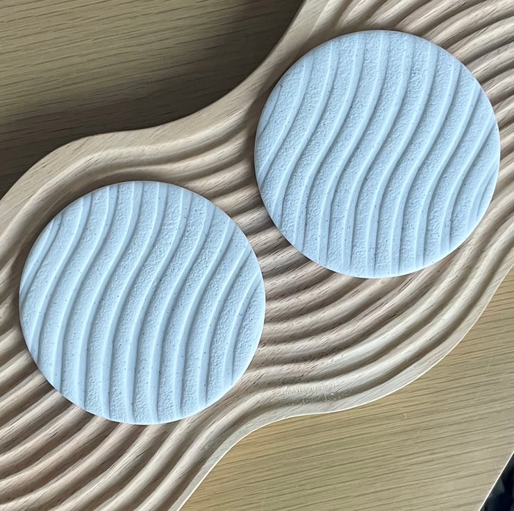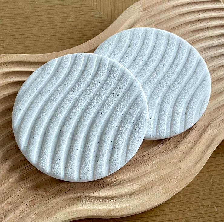Neutral coasters made from high-quality polymer clay. Tactile textured finish with subtle, stone-like sparkle and cork layer on reverse. Width approx. 10cm – suitable for most standard-sized cups. Price per pair.