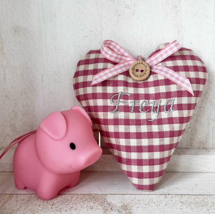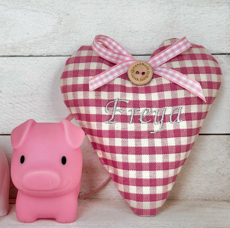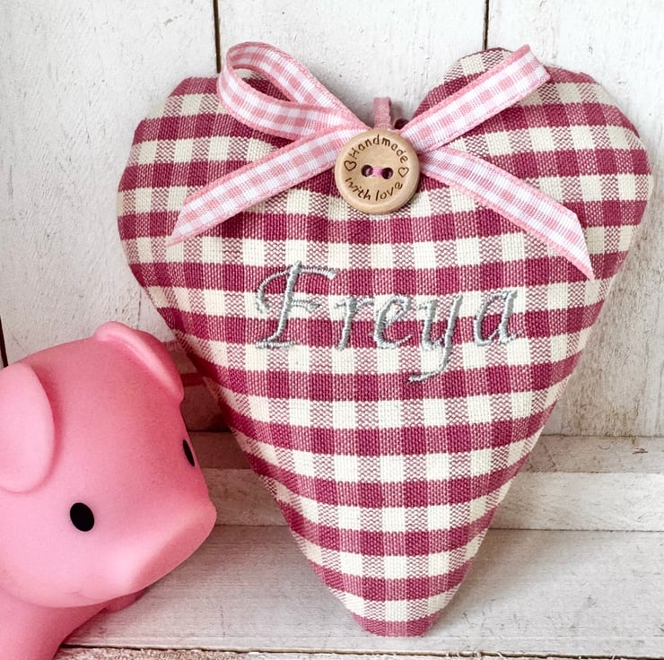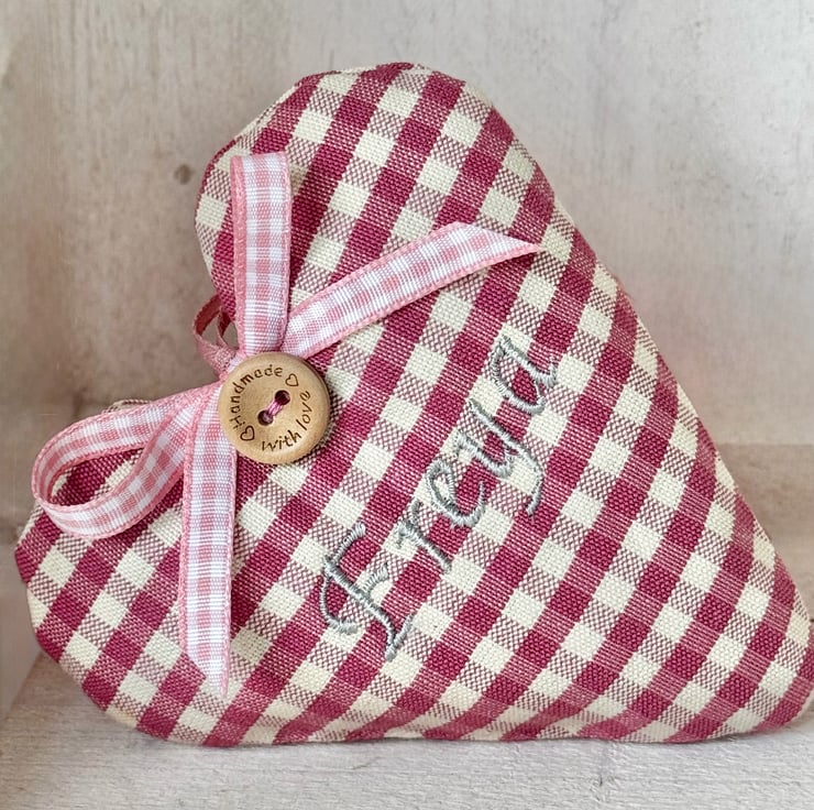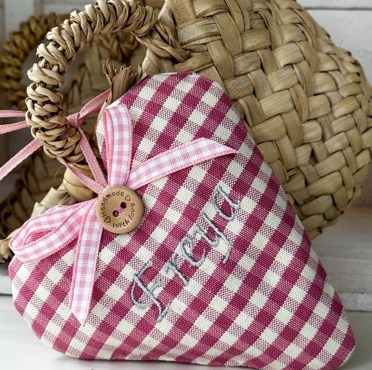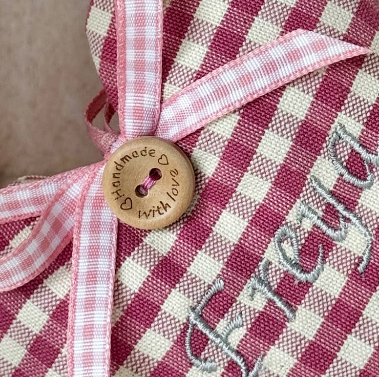 In soft-pink gingham cotton, generously filled with relaxing scented lavender (or with hypoallergenic wool stuffing) and finished with a sweet wooden button engraved with the words 'Handmade with love', plus narrow satin ribbon hanging ties and a pretty gingham ribbon bow.
