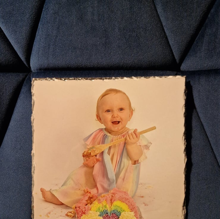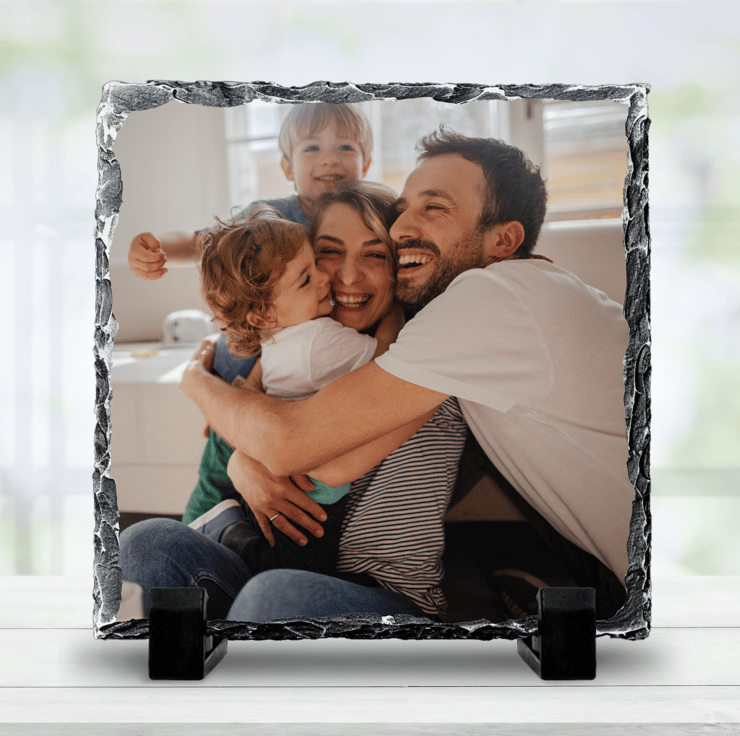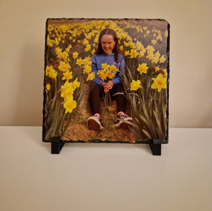 Any photo added to a 20x20cm, 20x15cm, 15cm heart or coaster photo slate, comes with 2 feet to stand it up.