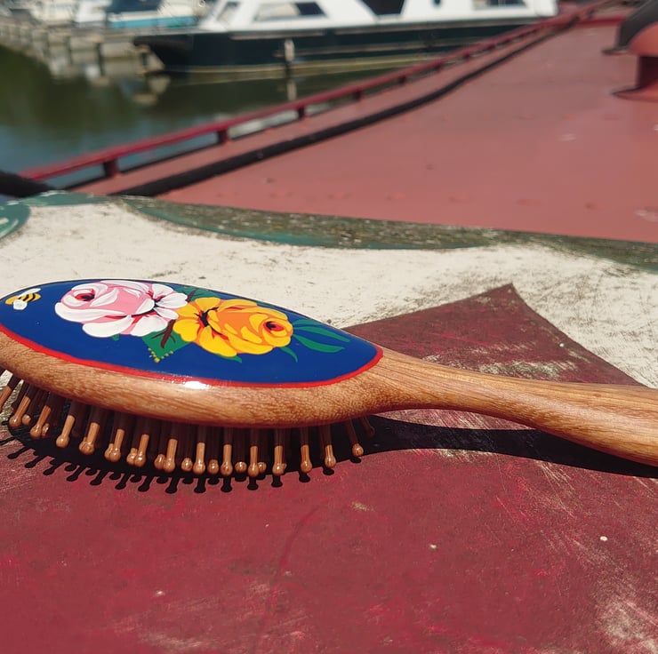The folk art of the British canals is often romanticised in our current times, now that we primarily use the canals for leisure, though the life of the boating families would have been very laborious in the heyday of the industry. The boaters used their rose and castle art to brighten their homes and provide decoration in a space too small to allow many items for purely decorative purposes. A decorated hairbrush like this is something they may well have found space for in the tiny boatmans cabin.