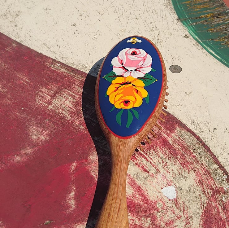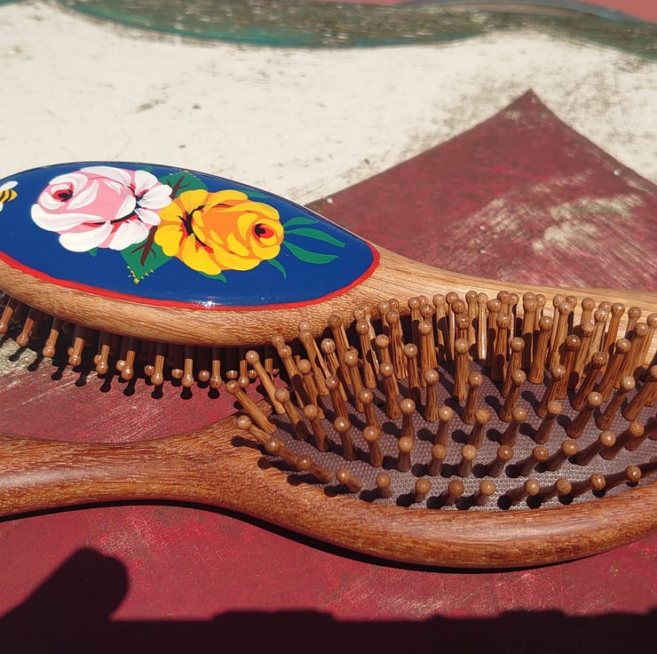 Beautiful roses adorn the back of this hairbrush. Made of wood with bamboo bristles it feels wonderful in the hand. The bristles are natural bamboo and good for distributing oils through the hair. The air cushion design makes it wonderful for a head massage to encourage hair growth.