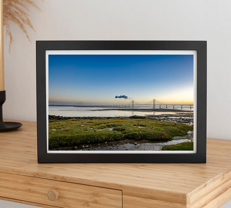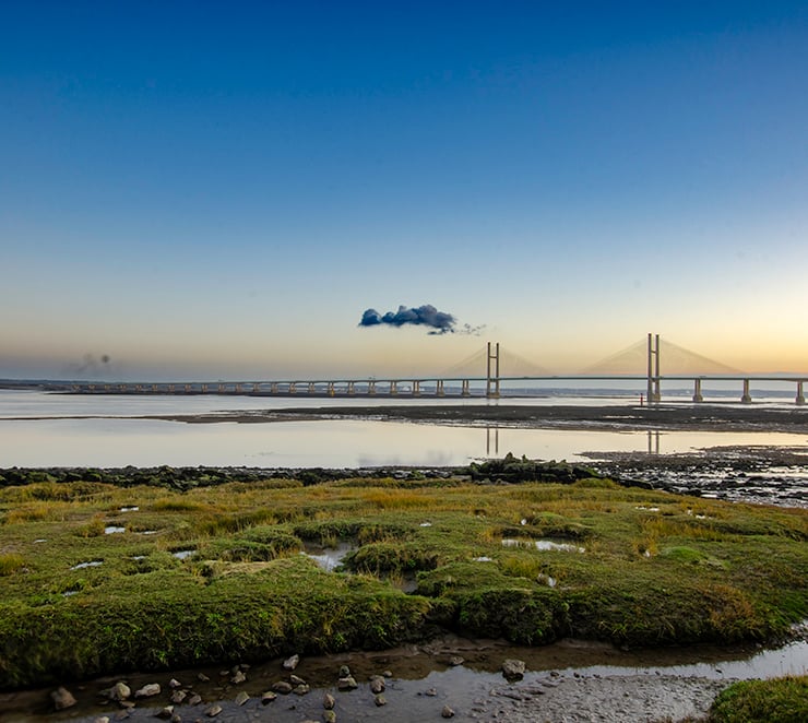 This image depicts a serene landscape featuring a wide, calm expanse of water reflecting the soft hues of a sunset. In the distance is the Prince of Wales Bridge stretching across the River Severn. The foreground showcases lush green marshland with patches of grass and small pools of water, adding texture and depth to the scene. The clear sky above is tinged with gentle gradients of blue and warm tones, enhancing the tranquil and picturesque atmosphere.