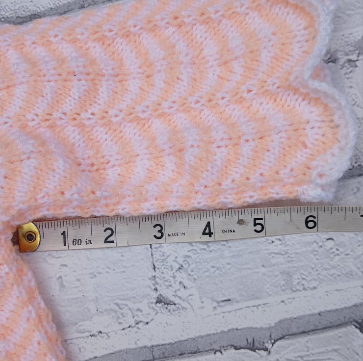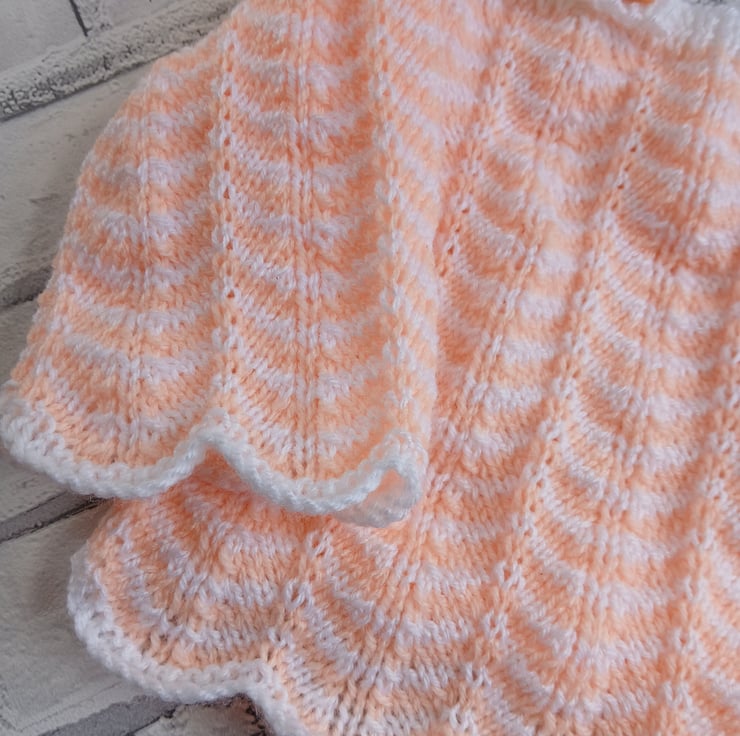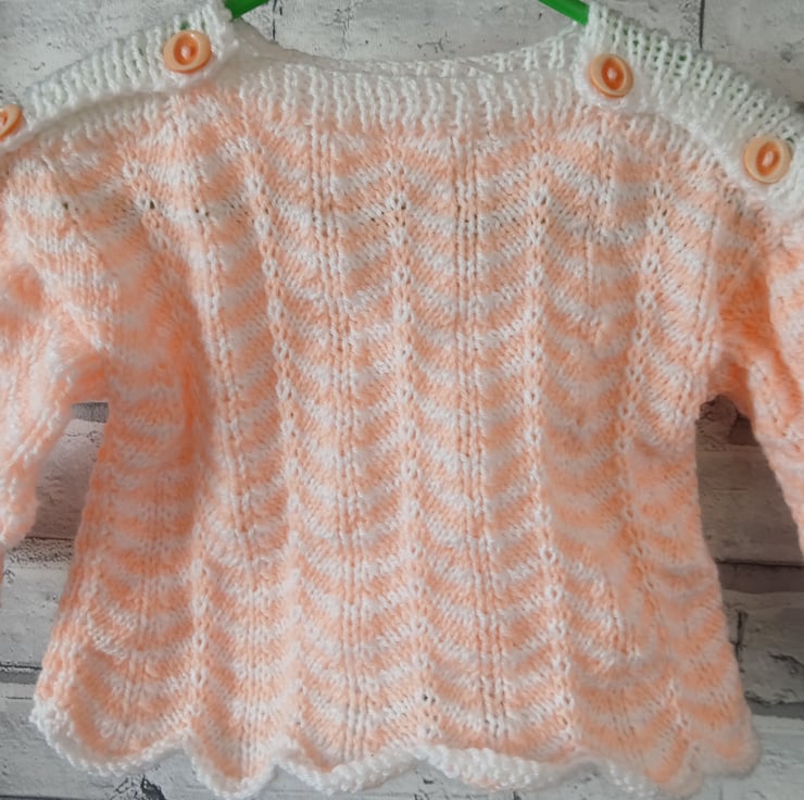 A beautiful hand- knitted jumper in a gorgeous apricot and white wavy design. The hem and sleeves have scalloped features with buttons on either side of the neckline. Perfect for Summer.