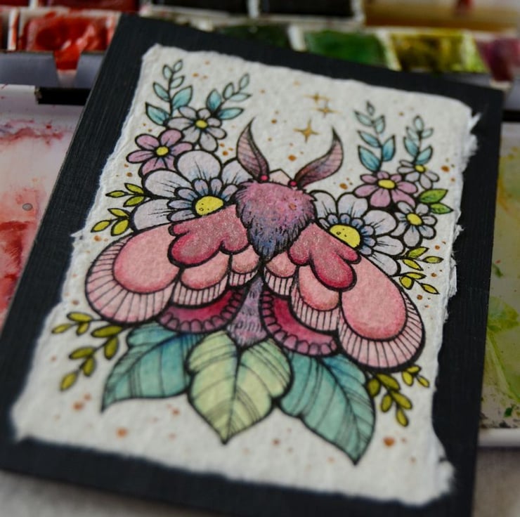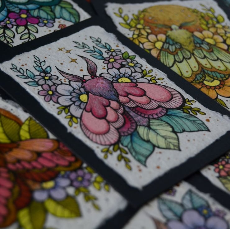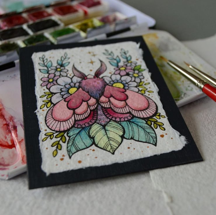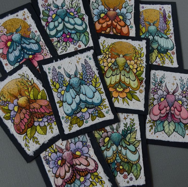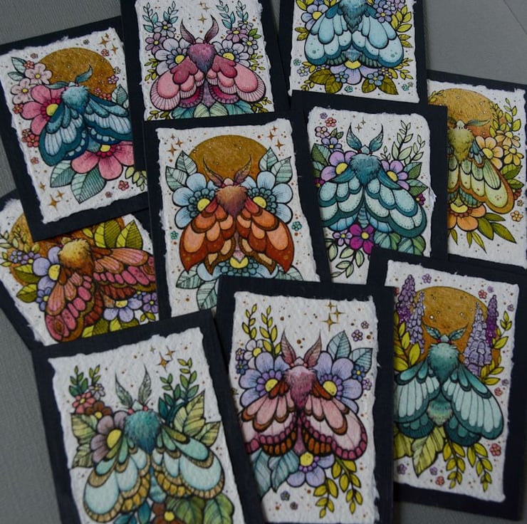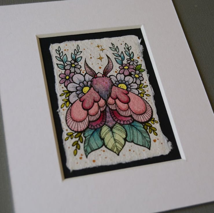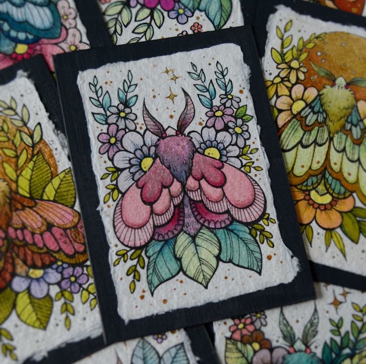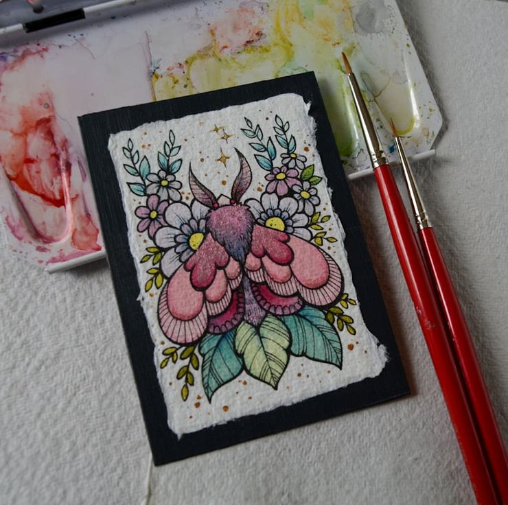 this aceo is an original artwork, hand drawn with a tiny 0.05 nibbed pen, then coloured with ink, artists pens and watercolour paints, on indian khadi paper. khadi paper is handmade from recycled cotton rag, it has a lovely textured surface and deckled edges. i have then mounted the illustration onto 300gsm cardstock, hand painted with a paynes grey to create a dark surrounding edge/background.