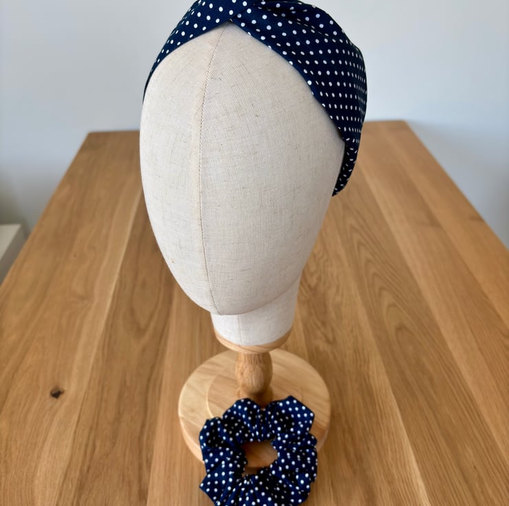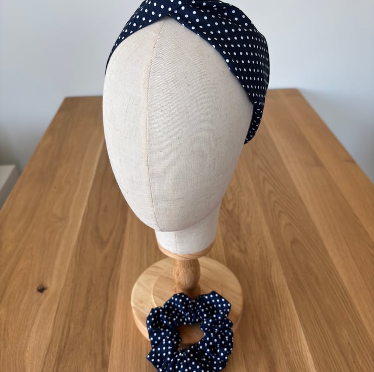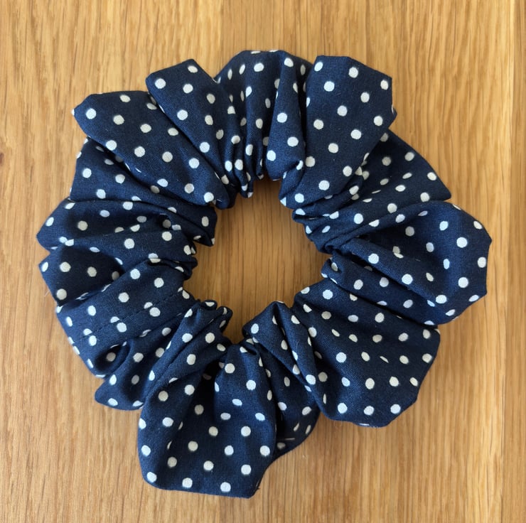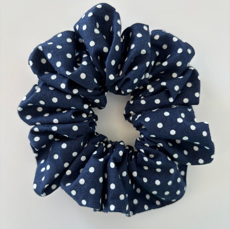 Handmade scrunchie in soft 100% cotton, in a beautiful classic print of navy with white spots.