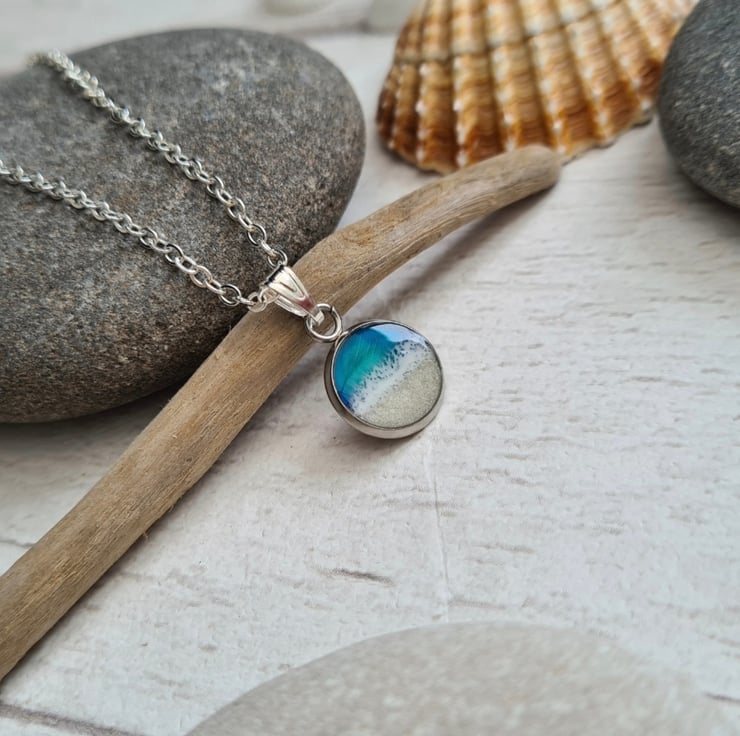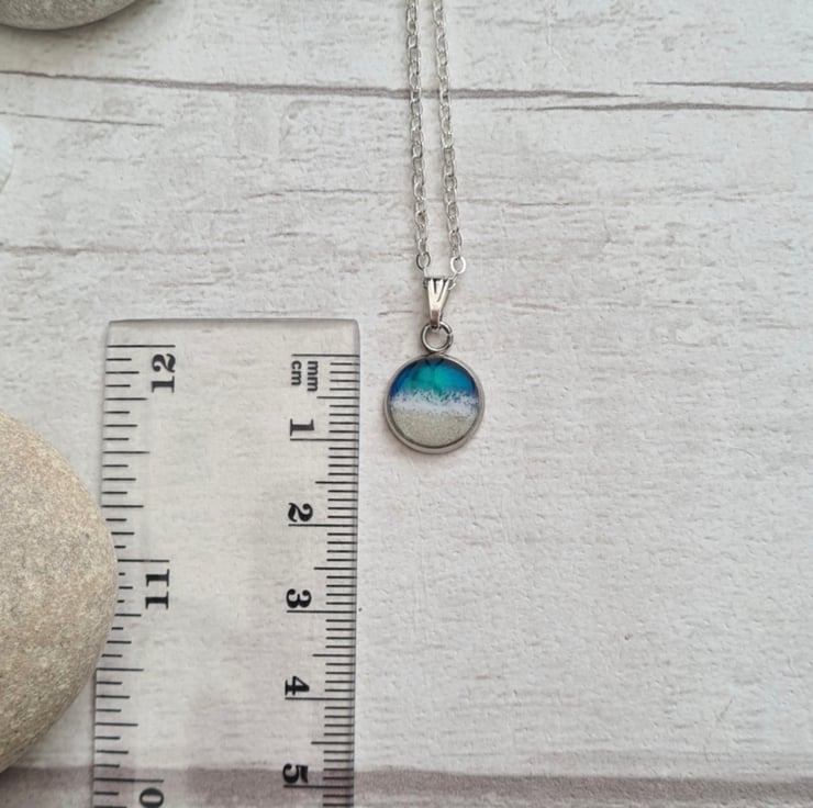 Capture the beauty and serenity of the sea with this Ocean Waves Pendant. Perfect for anyone who loves the ocean, this pendant will bring happy memories of beach days spent by the shore. The ocean waves are carefully set in resin, encased in a 10mm stainless steel tray pendant, and paired with an 18-inch silver chain necklace for a timeless look.