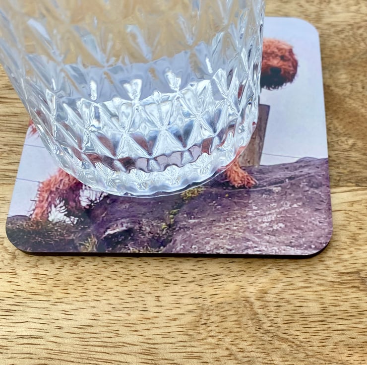 The square mdf coaster measures 10cm x 10cm and is 3mm thick. It has a cork backing to protect surfaces and a glossy wipeable finish. (Please do not submerge in water though)