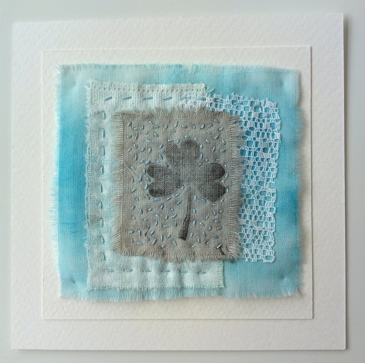 An original piece of mixed media textile art, featuring my own lino printed clover leaf design on an embroidered textile collage.