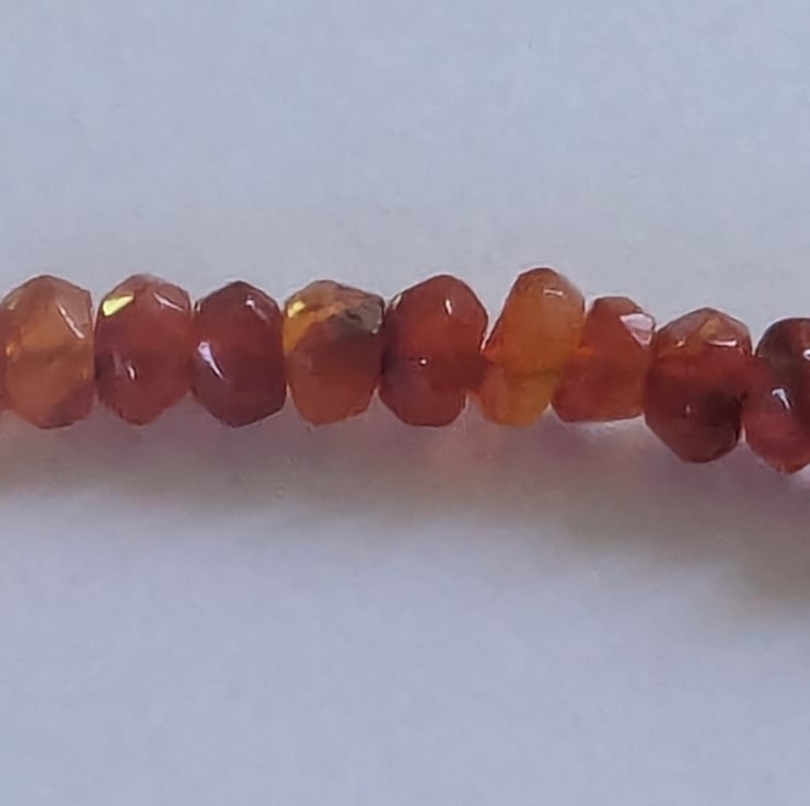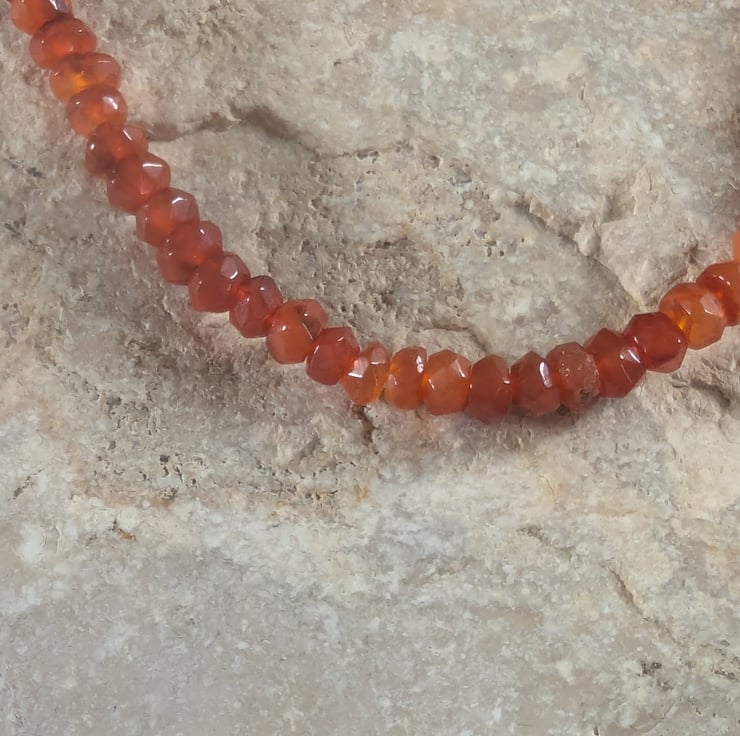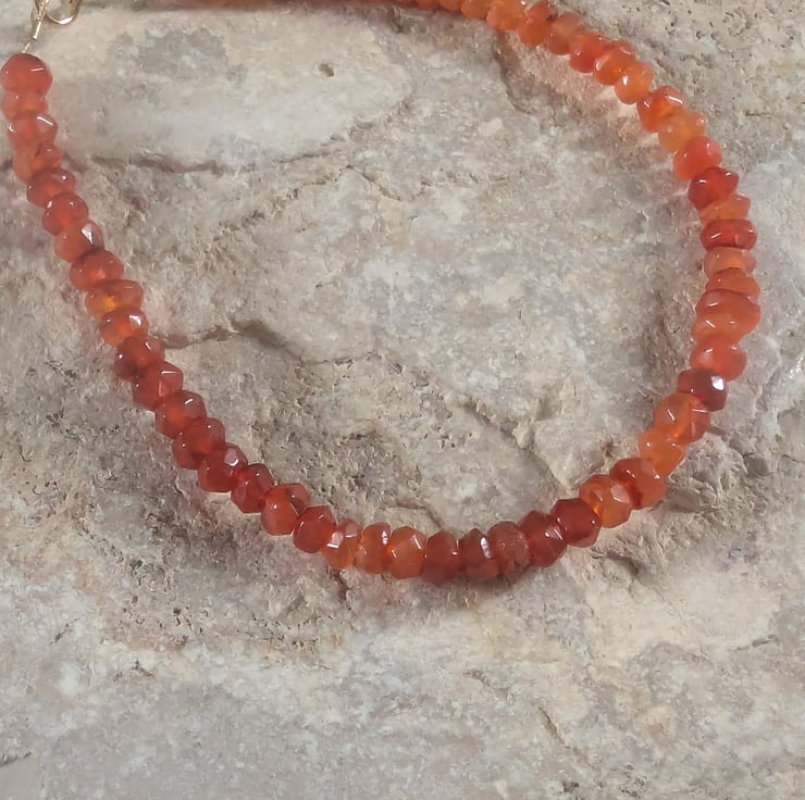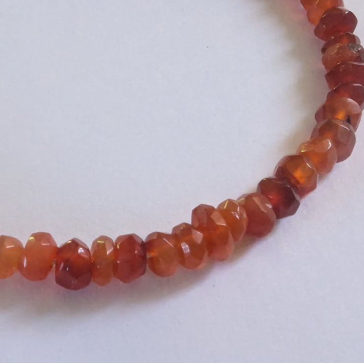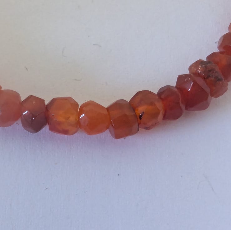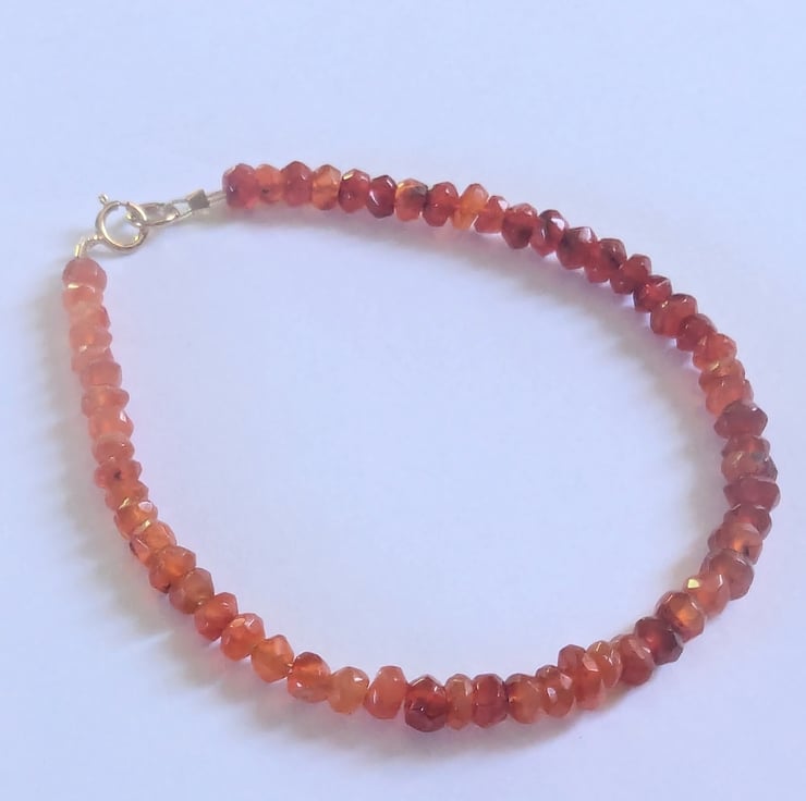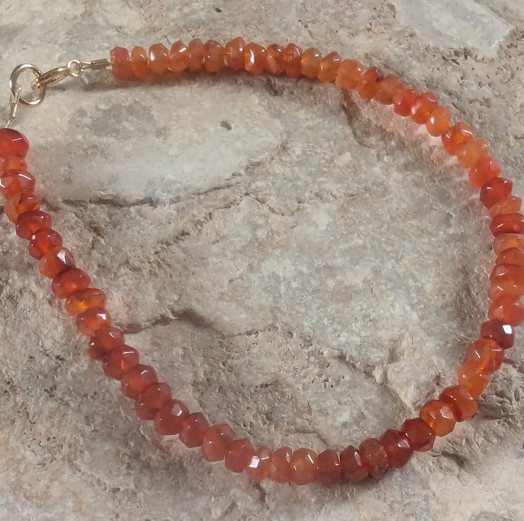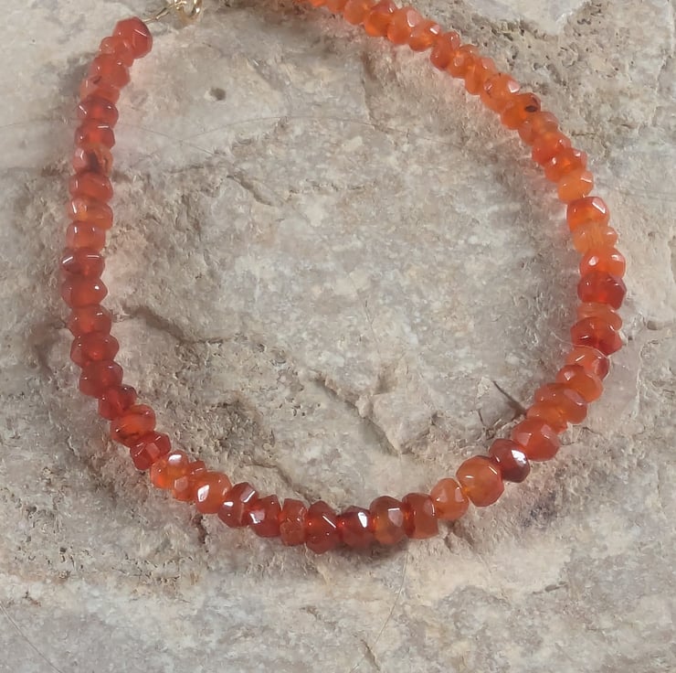 Gorgeous fiery faceted carnelian beads strung onto wire and finished off with a simple gold filled clasp. It measures approximately 7.5 inches. The beads are approximately 4-5 mm.