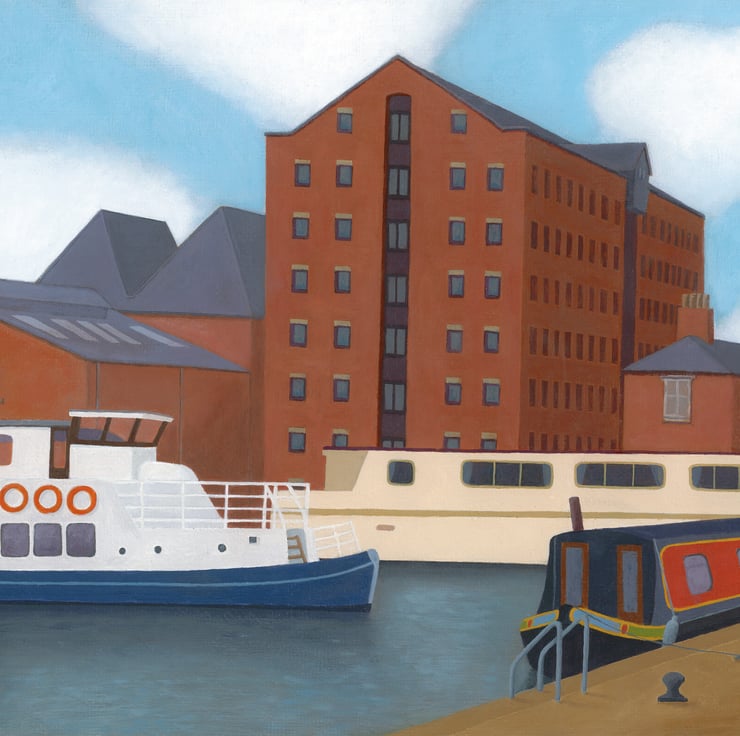 This is an original painting of boats and old industrial warehouse buildings in Gloucester Docks in Gloucestershire. It's painted in acrylic on primed board inside a hand-painted solid wooden frame. The painting is 28cm x 35.5cm (11 x 14") and the frame is 37cm x 44.5cm.