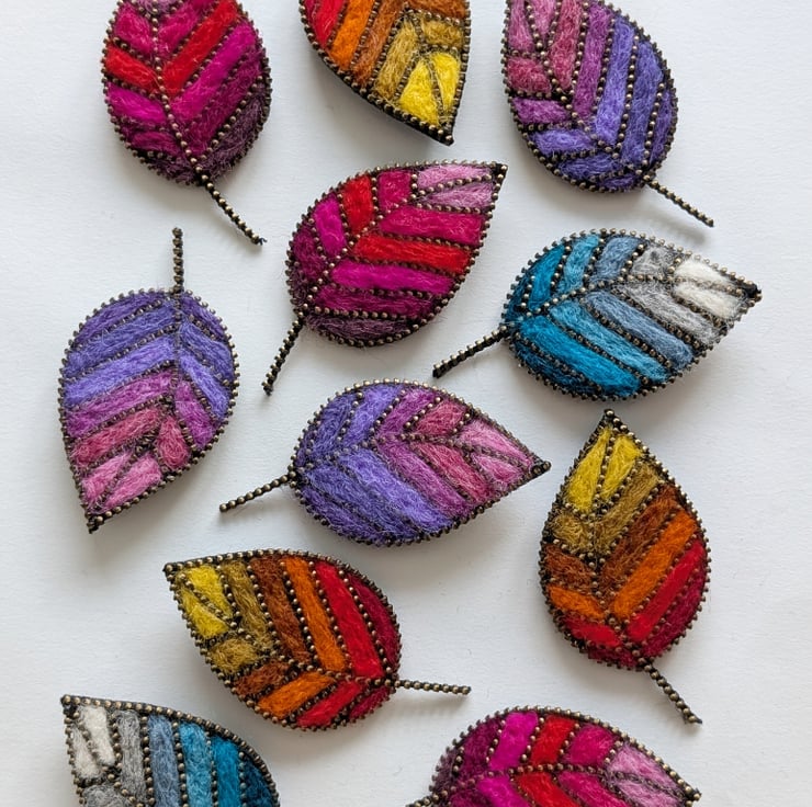 Classic hand felted Autumn Colours Leaf Brooch. Using roving wool I hand needle felt the brooch with a singular needle and edge with re-purposed metal zips.