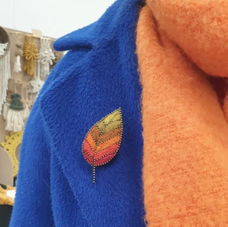 The brooch feels soft, very tactile and light in weight, with firm structure and strength from the metal edging detail that gives a lovely glint in the sunshine. Finished with a metal brooch bar back safety pin - So easy to wear with jackets, jumpers, hats, bags, A real eye catching, one-of-a-kind accessory that adds a 'pop' of colour and interest to an outfit, any time of year.