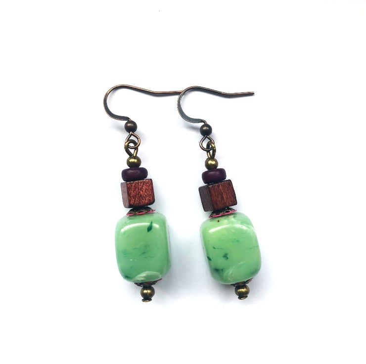 Boho Style Green Square Bead Brown Wood Purple Dangle Drop Up-cycled Earrings