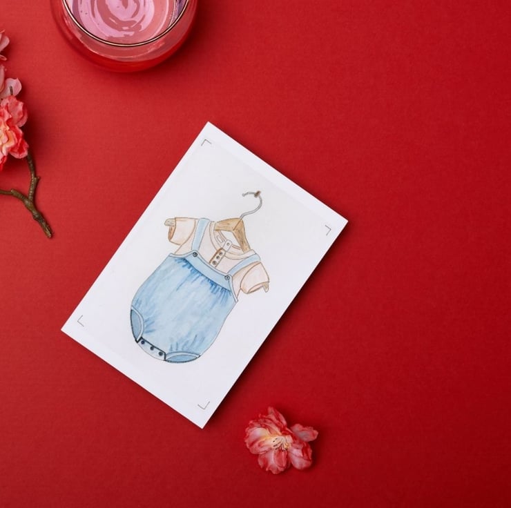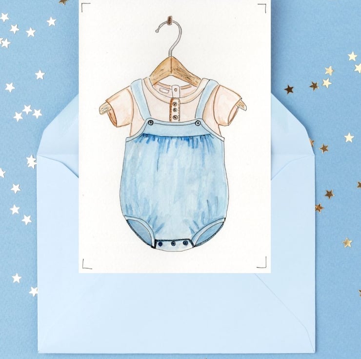 Celebrate the arrival of a new little one with this original, hand-painted card featuring a softly shaded blue dungaree romper over a classic cotton tee—simple, nostalgic, and full of charm.