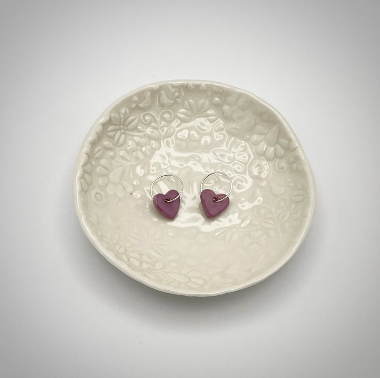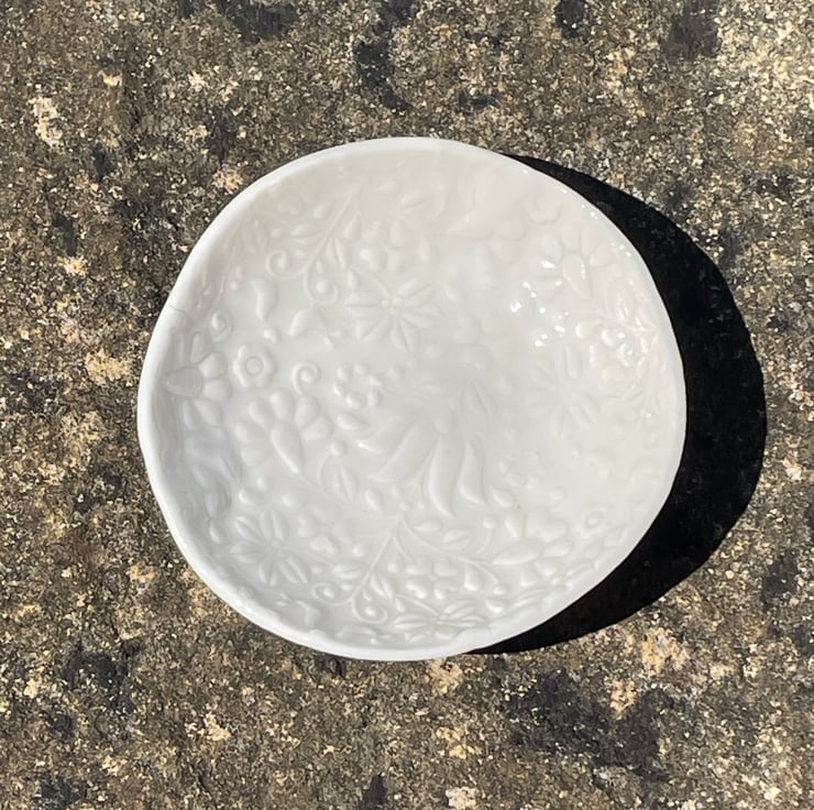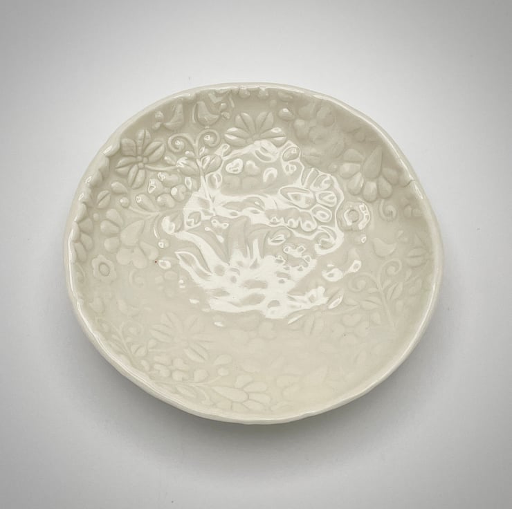 This is my white porcelain trinket dish embossed with a botanical design, it's perfect for jewellery, trinkets or little treasures.