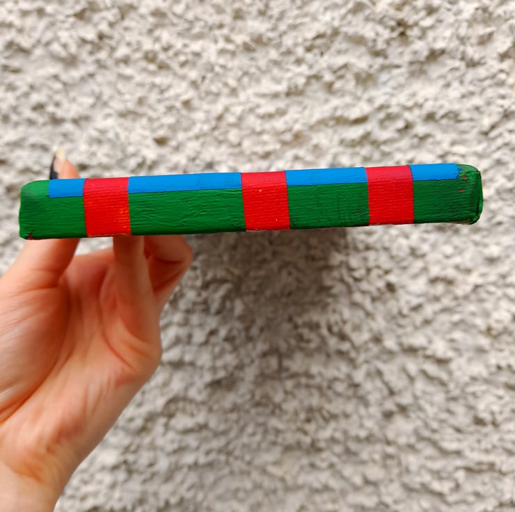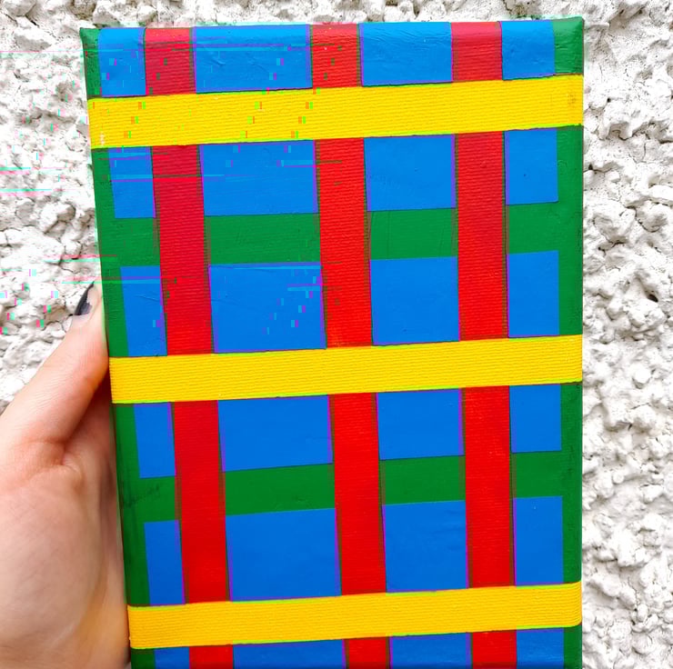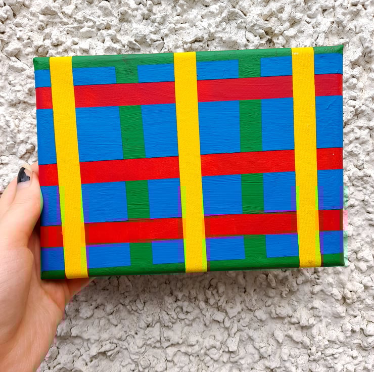 While galaxies are my usual style, I wanted to try a new technique of layering paint to create a checkered effect. When I finished I realised it more resembled tartan than a checkers and dubbed it 'Party Plaid'