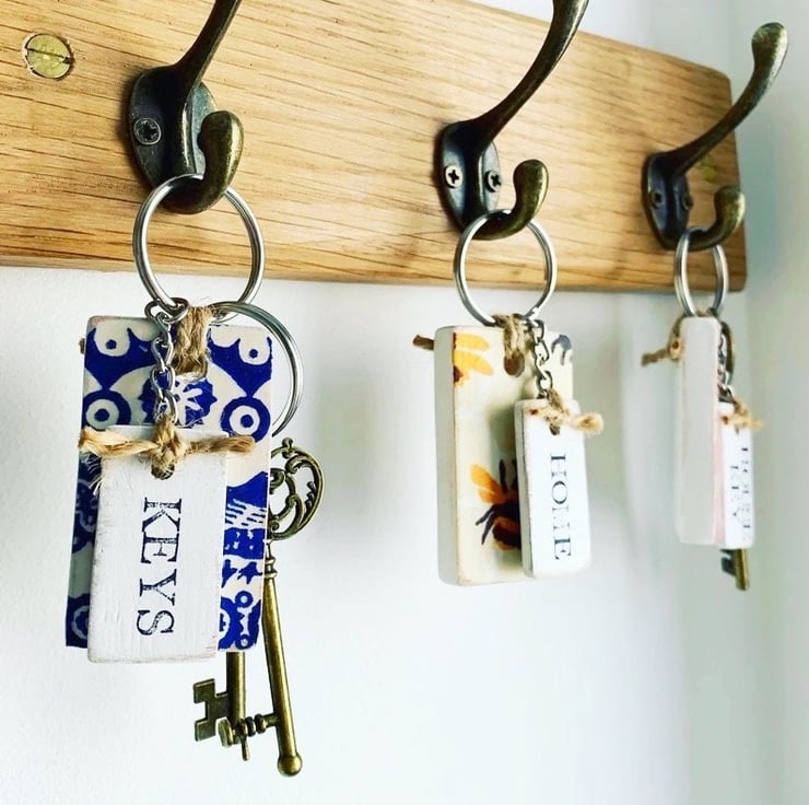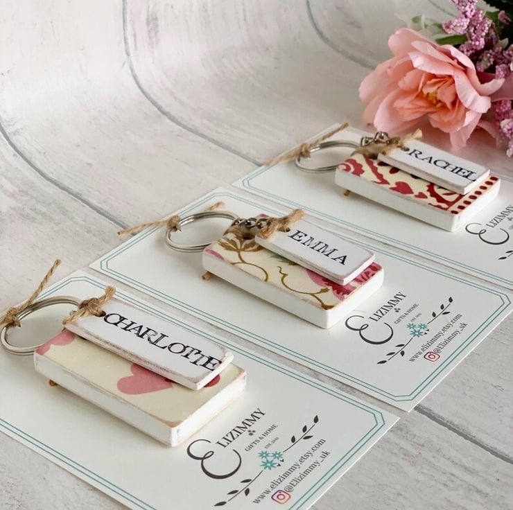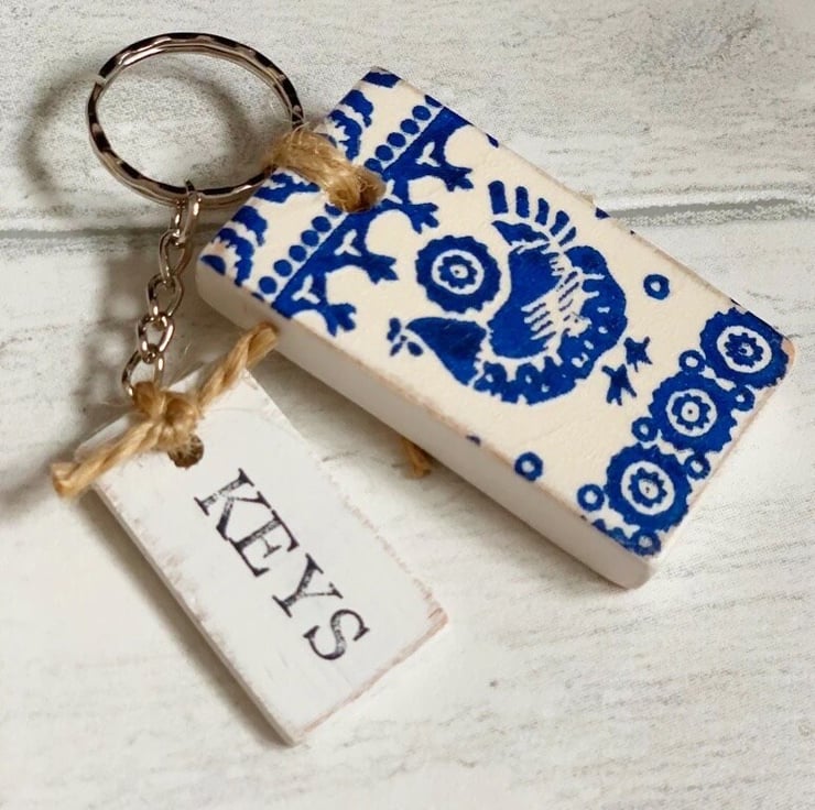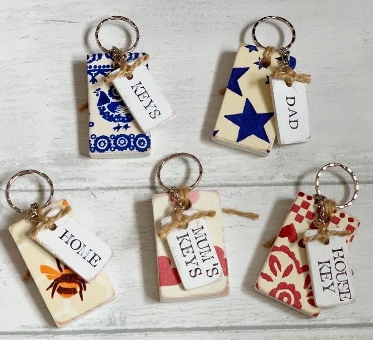 Personalised Wooden Key Fobs. Emma Bridgewater Inspired Decoupaged Key Rings