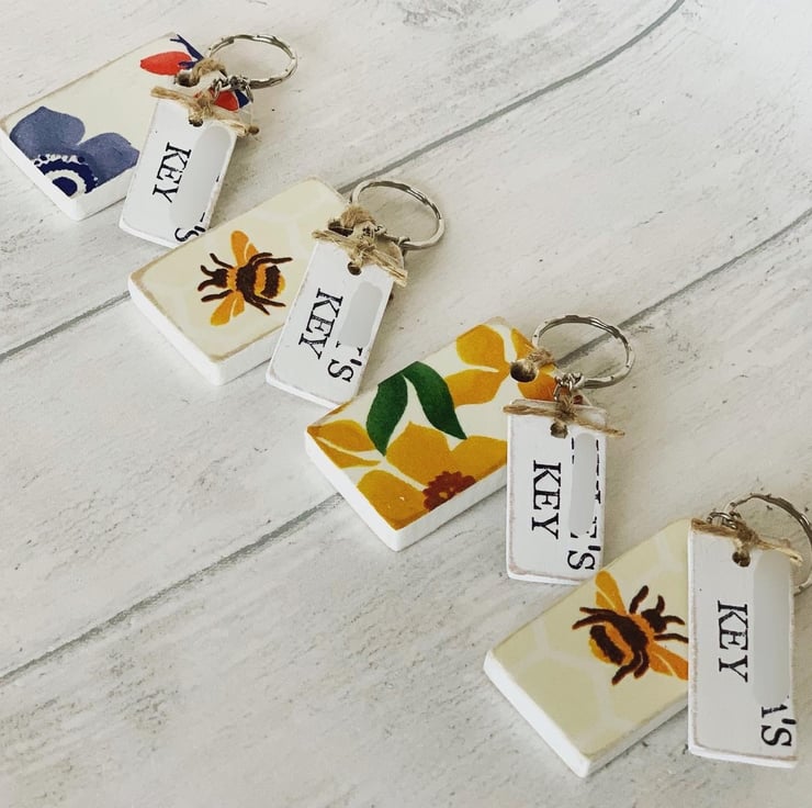 These entirely handmade chunky wooden key fobs are decoupaged using genuine Emma Bridgewater napkins in many beautiful designs.