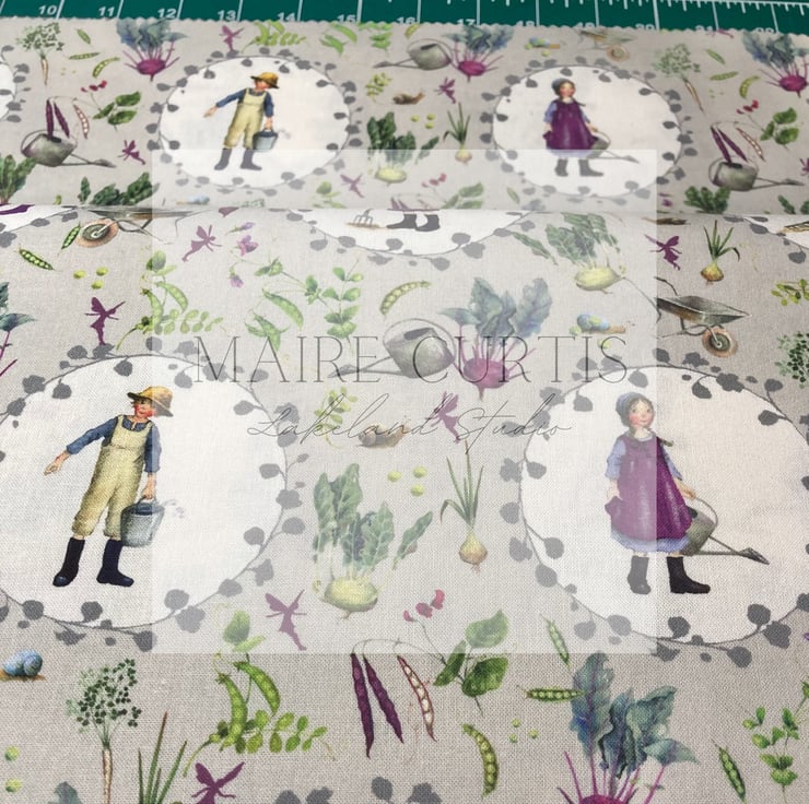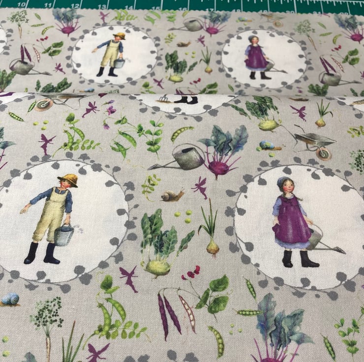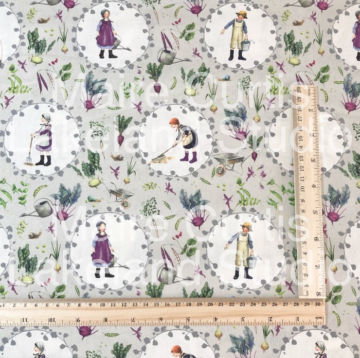 This lovely fabric has delightful gardening character cameos on a grey background scattered with harvested garden vegetables.