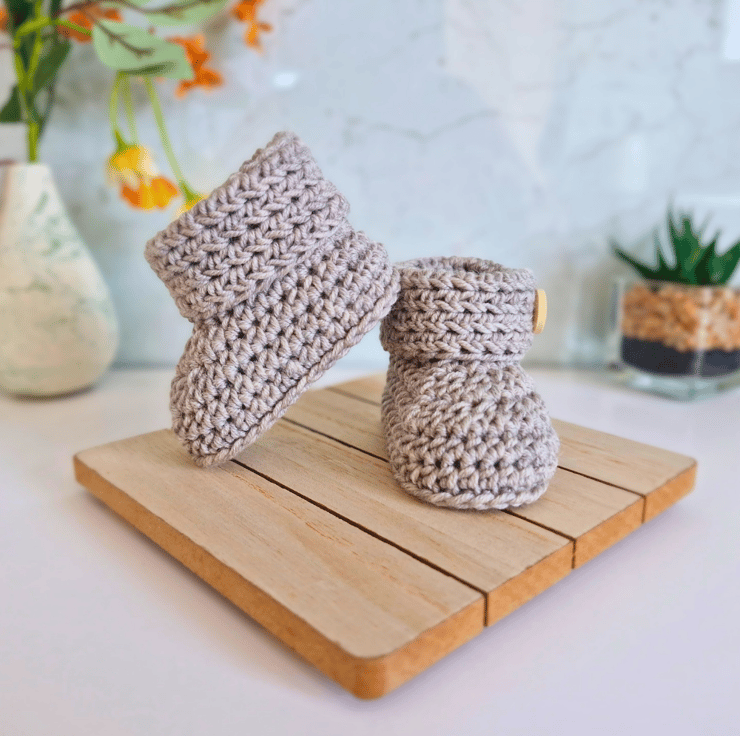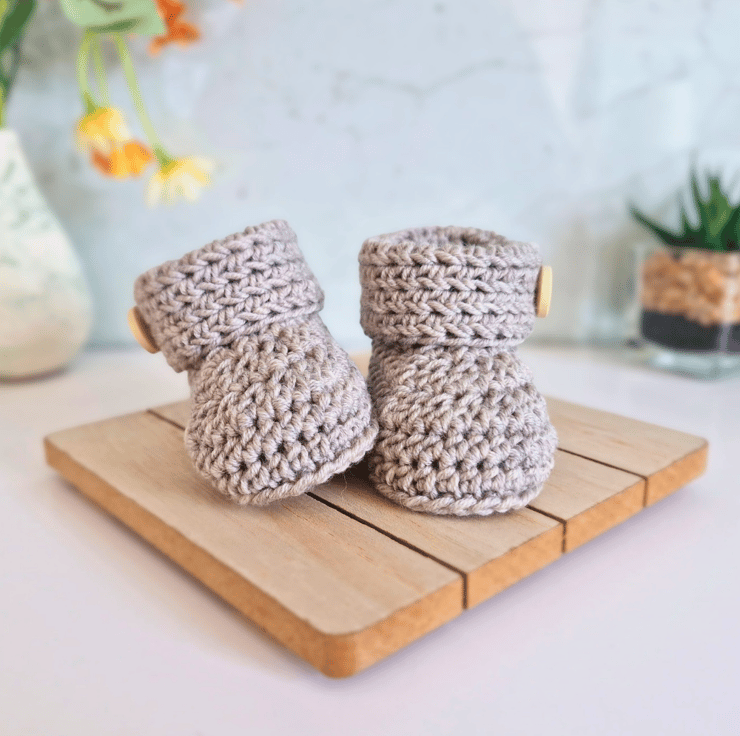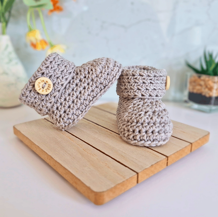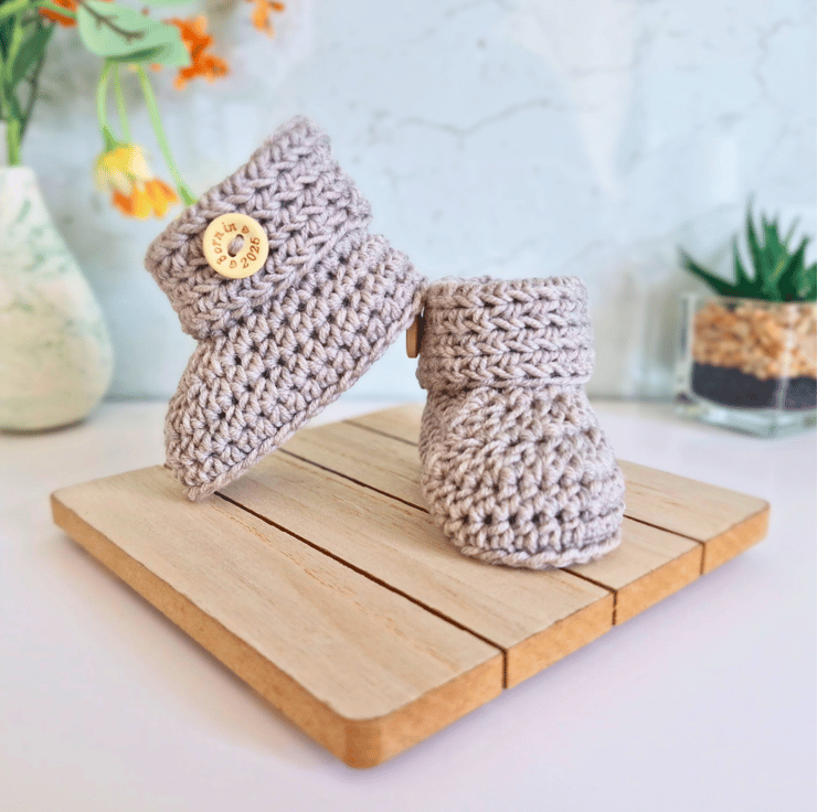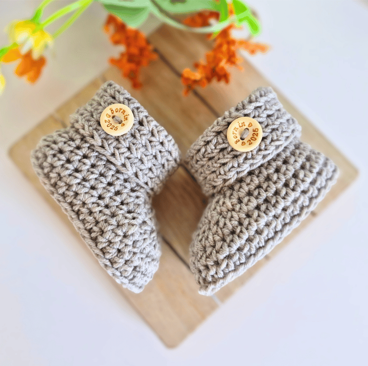 Handmade Newborn Baby Booties with 'Born In 2025' Buttons – Merino Wool – Ready to Ship