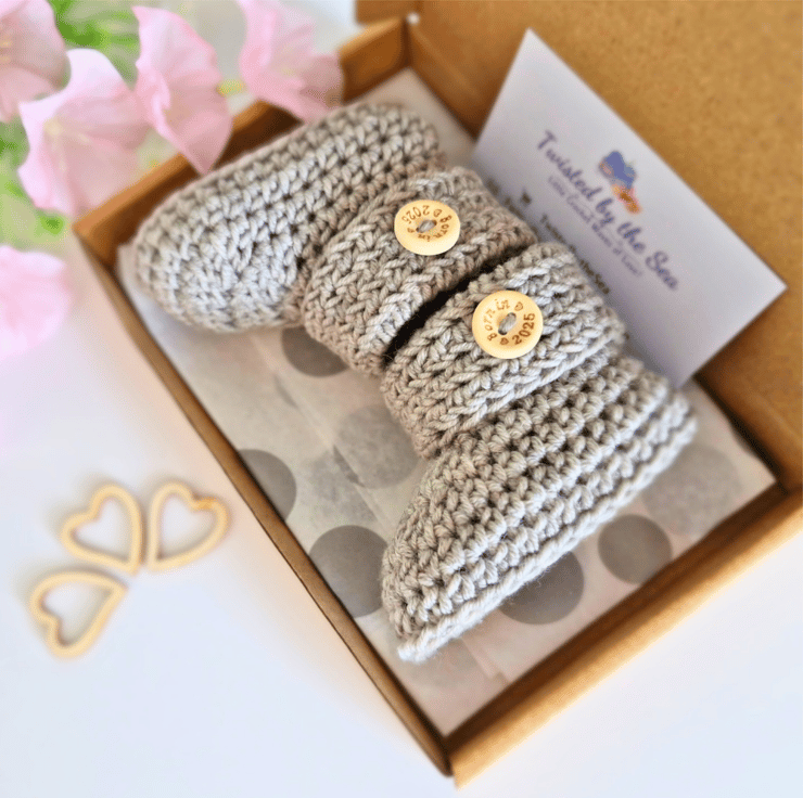 Welcome to Twisted by the Sea – home of beautifully handmade crochet baby gifts including baby booties, hats and cardigans. Each item is thoughtfully crafted using soft Stylecraft Special DK yarn, perfect for new arrivals, baby showers, and keepsake gifts. All made from my coastal home in Lincolnshire.