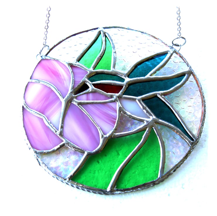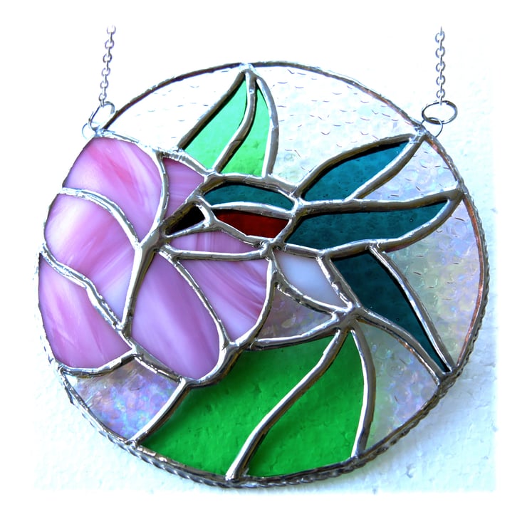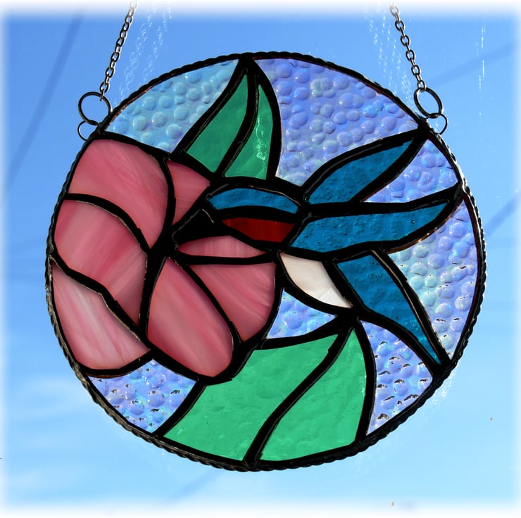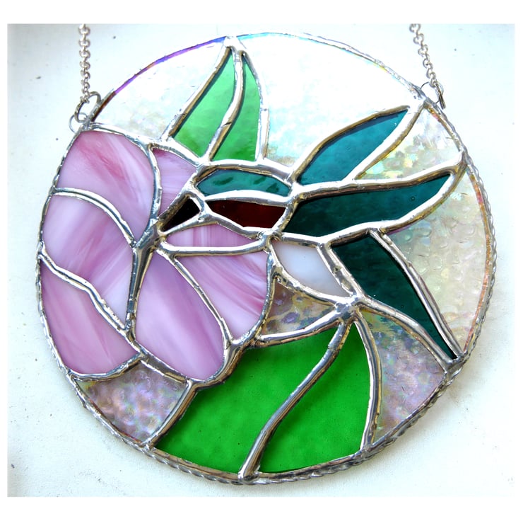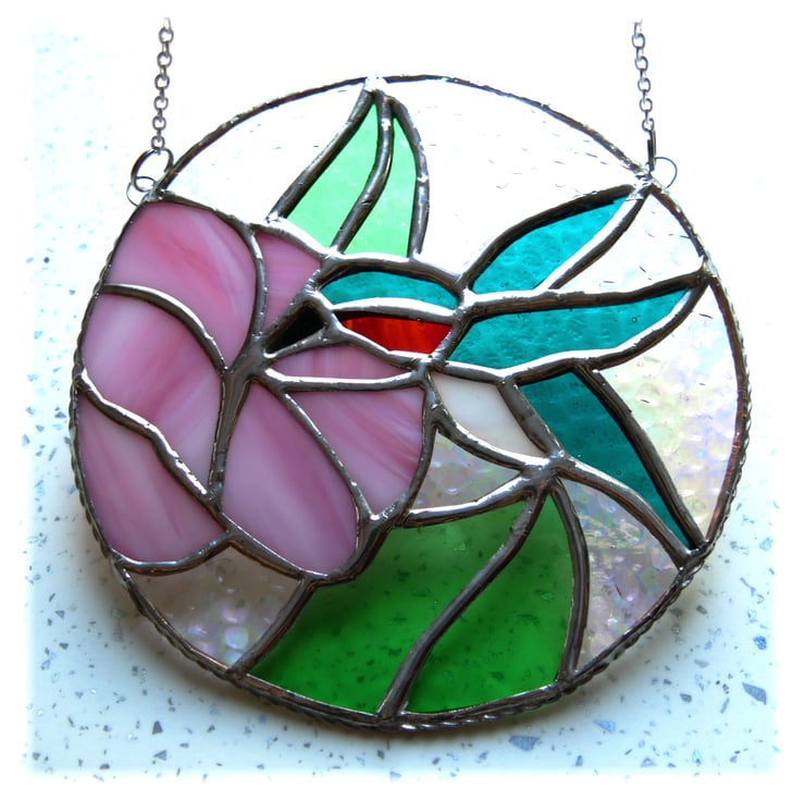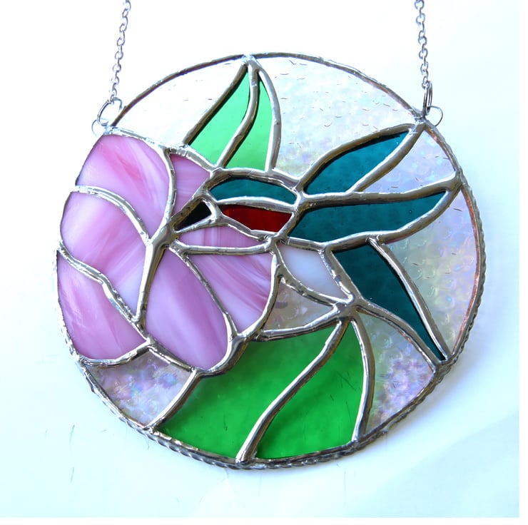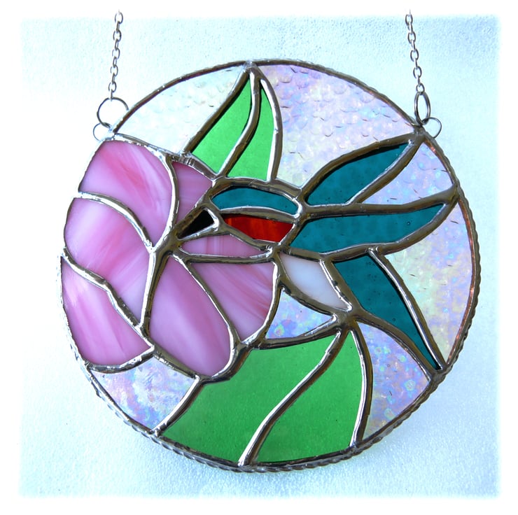 A stained glass suncatcher handmade using the Tiffany copper foil technique. A hummingbird dipping its beak into the nectar of a pretty pink flower.
