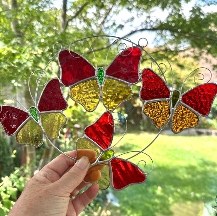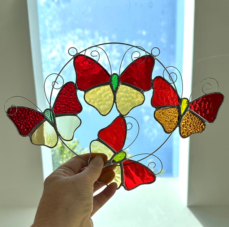 This suncatcher consists of four butterflies made from 4 different types of red stained glass with amber stained glass.