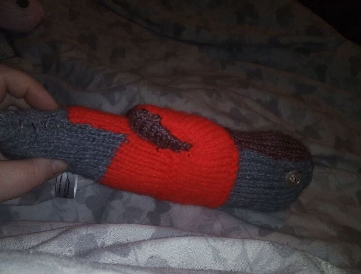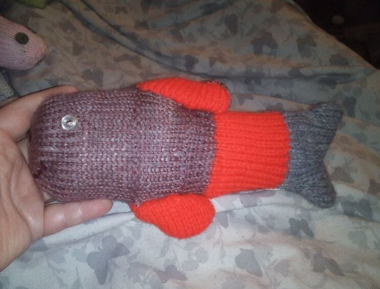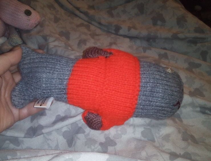 Grey, Red And Dark Salmon Midi MerFish with Cream Pearly Eyes Knitted Soft Toy