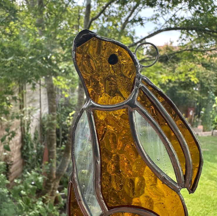 Each piece of glass has been hand cut, ground, washed, foiled and soldered together. before being washed again. The eye detail has been added with glass paint and the nose black patina. A ring has been attached for hanging purposes.
