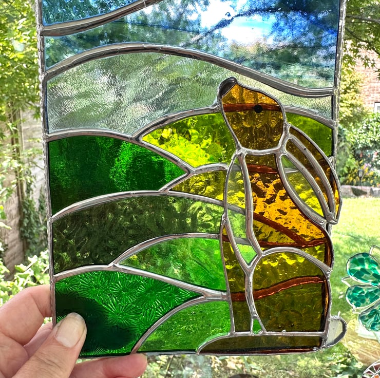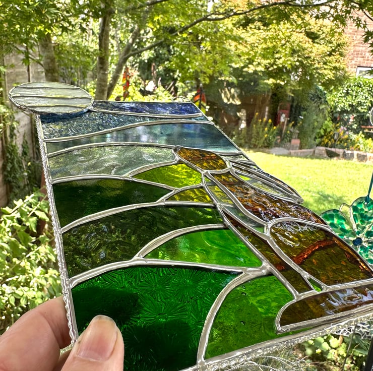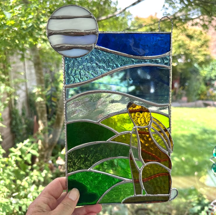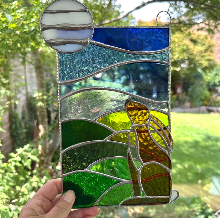 Each piece of glass is cut by hand, ground, washed, foiled and soldered together. The moon and hare have been attached on top of the panel. I have added a twisted wire to form a decorative boarder, add strength and also form the hanging rings.
