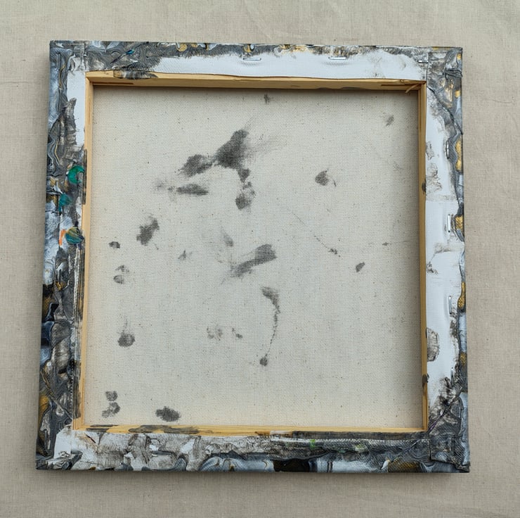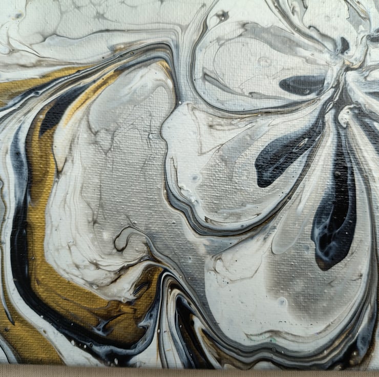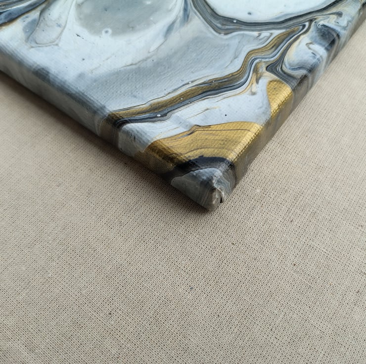 Acrylic Pour Canvas, with a gold, silver and white colour scheme. This canvas has been varnished with gloss varnish, will contain wedges for keeping canvas taught. The canvas size is W 25cm x H 25cm x D 1.5cm