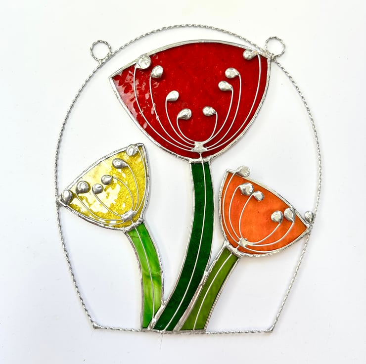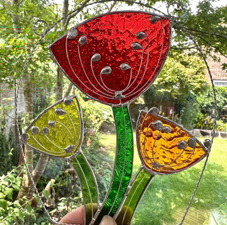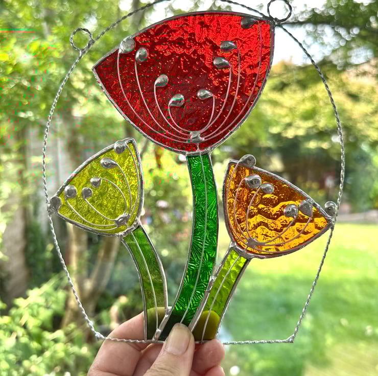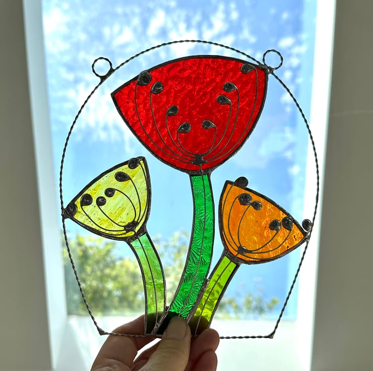 Each piece of glass has been hand cut, ground, washed, foiled and soldered together. The frame has been made from twisted tinned copper wire to give it strength and interest. The details on the flower heads and stem have been made from tinned copper wire.